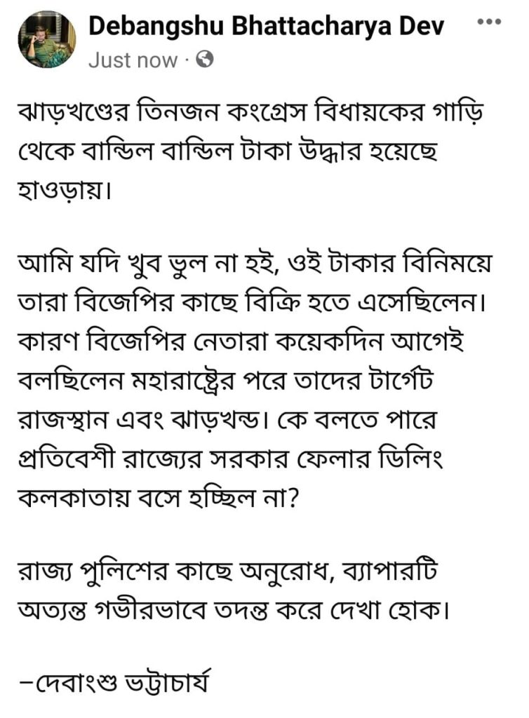 এ প্রসঙ্গে তৃণমূল কংগ্রেস মুখপাত্র দেবাংশু ভট্টাচার্য বলেন, “ঝাড়খণ্ডের তিনজন কংগ্রেস বিধায়কের গাড়ি থেকে বান্ডিল বান্ডিল টাকা উদ্ধার হয়েছে হাওড়ায়। আমি যদি খুব ভুল না হই, ওই টাকার বিনিময়ে তারা বিজেপির কাছে বিক্রি হতে এসেছিলেন। কারণ বিজেপির নেতারা কয়েকদিন আগেই বলছিলেন মহারাষ্ট্রের পরে তাদের টার্গেট রাজস্থান এবং ঝাড়খন্ড। কে বলতে পারে প্রতিবেশী রাজ্যের সরকার ফেলার ডিলিং কলকাতায় বসে হচ্ছিল না? রাজ্য পুলিশের কাছে অনুরোধ, ব্যাপারটি অত্যন্ত গভীরভাবে তদন্ত করে দেখা হোক।”