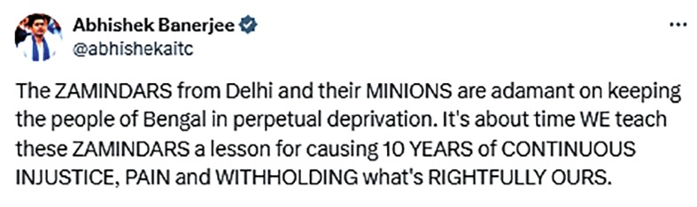 প্রতিবেদন : বিজেপি বাংলার গরিব মানুষকে শান্তিতে থাকতে দিতে চায় না। বাংলার মানুষের সঙ্গে বঞ্চনা চালিয়ে যেতে চাইছে তারা। তাই একশো দিনের কাজের শ্রমিকদের সাহায্যার্থে চালু হওয়া সহায়তা শিবিরেও হামলা চালাতে কসুর করল না বিজেপি। বিজেপি নেতাদের এই জমিদারি মানসিকতাকে এবার একহাত নিলেন তৃণমূলের সর্বভারতীয় সাধারণ সম্পাদক অভিষেক বন্দ্যোপাধ্যায়। নিজের এক্স হ্যান্ডেলে তিনি লেখেন— দিল্লির জমিদাররা এবং তাদের একাংশ বাংলার মানুষকে চিরকালের বঞ্চনার মধ্যে আটকে রাখতে অনড়। এই জমিদারদের ১০ বছরের ক্রমাগত অন্যায়, যন্ত্রণার জবাব দিতে তাদের পাঠ শেখানোর সময় এসেছে এবার।