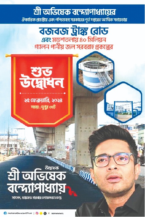 সেই কথা মতোই ২৫ ফেব্রুয়ারি বজবজ ট্রাঙ্ক রোড ও মহেশতলায় ৪০ মিলিয়ন গ্যালন জলপ্রকল্পের উদ্বোধন করবেন সাংসদ তথা তৃণমূল কংগ্রেসের সর্বভারতীয় সাধারণ সম্পাদক অভিষেক বন্দ্যোপাধ্যায়। এছাড়াও প্রতিশ্রুতি মতোই মহেশতলায় উড়ালপুলের নিচের রাস্তারও উদ্বোধন করবেন ডায়মন্ডহারবারের দুইবারের সাংসদ। সোমবারই ৫৭ বছর ধরে বিরোধী পক্ষের সাংসদ-বিধায়করা যে সমস্যার সমাধান করতে পারেনি, সেই কাজ করে দেখিয়েছেন তিনি। কথা দিয়েছিলেন ৫ বছরের মধ্যে চড়িয়াল সেতুর উদ্বোধন করবেন, সেই কথা রেখেছেন অভিষেক। এবার একসপ্তাহের মধ্যেই এলাকার মানুষের জন্য মহেশতলায় জলপ্রকল্পের উদ্বোধন করবেন তিনি।
