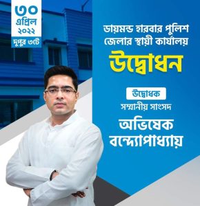 ডায়মন্ড হারবার পুলিশ জেলার স্থায়ী কার্যালয় উদ্বোধন করবেন তৃণমূল কংগ্রেস সাংসদ অভিষেক বন্দ্যোপাধ্যায় (MP Abhishek Banerjee)। ৩০ এপ্রিল অর্থাৎ আগামী শনিবার দুপুর ৩ টেয় কার্যালয় উদ্বোধন করবেন তৃণমূল কংগ্রেসের সর্বভারতীয় সাধারণ সম্পাদক (Abhishek Banerjee)।