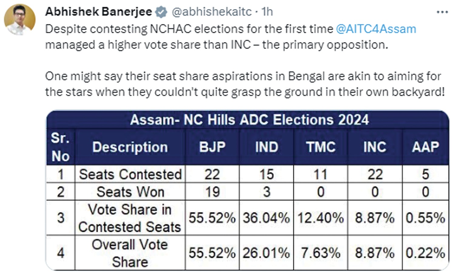 প্রতিবেদন : নর্থ কাছাড় হিলস অটোনমাস কাউন্সিল (অসম, এনসিএইচএসি) নির্বাচনে কংগ্রেসের থেকে বেশি ভোট পেল দল। তৃণমূলের ভোট শেয়ার ১২.৪০ শতাংশ। কংগ্রেস সেখানে মাত্র পেয়েছে মাত্র ৮.৮৭ শতাংশ। শনিবার রাতে নিজের এক্স হ্যান্ডেলে এই তথ্য দিয়ে দলের সর্বভারতীয় সাধারণ সম্পাদক অভিষেক বন্দ্যোপাধ্যায় কংগ্রেসকে কটাক্ষ করে লিখেছেন, প্রধান বিরোধী দল হয়েও যারা নিজেদের একসময়কার ঘাঁটিতে জিততে পারে না, জমি ধরে রাখতে পারে না, তারা আশা করে আসন ভাগাভাগির ক্ষেত্রে বাংলায় তাদের তথাকথিত তারকাদের জন্য তাদের পছন্দমতো আসন পাবে বা তাদের ছাড়া হবে! উল্লেখ্য, কংগ্রেস নেতৃত্ব লোকসভা নির্বাচনে বাংলা থেকে একাধিক আসন আশা করে তৃণমূলের থেকে। কিন্তু তৃণমূল কংগ্রেস যেখানে একাই বাংলায় বিজেপিকে রুখে দিতে সক্ষম আর সেটা প্রমাণিত, সেখানে কংগ্রেসের এই উচ্চাশা নিয়ে প্রশ্ন উঠতে বাধ্য। বিশেষ করে অসমের এই নির্বাচনী ফলাফলের পর তো এই প্রশ্ন ও চর্চা আরও বেশি করে জোরদার হবে। কী বলবে এবার কংগ্রেস নেতৃত্ব?