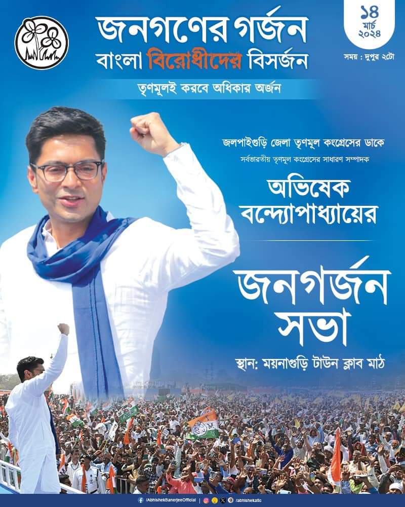 জনগণের গর্জনে বাংলা বিরোধীদের বিসর্জন হবে বলেই মনে করা হচ্ছে। বৃহস্পতিবার দুপুর দুটোয় অভিষেকের জনসভা হবে জলপাইগুড়ির ময়নাগুড়ি টাউন ক্লাব মাঠে। ১০ মার্চ ব্রিগেডের মঞ্চ থেকে বাংলার মানুষের প্রতি অভিষেক অনুরোধ করেছিলেন, ‘এমন আওয়াজ তুলুন, যাতে মেরুদন্ড কেঁপে যায় আর দিল্লির বুকে ভূমিকম্প অনুভূত করে বহিরাগত নেতারা ।’