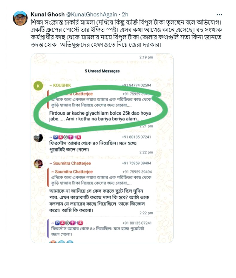 প্রতিবেদন : সহানুভূতির নামে এ-যেন একেবারে ঘুরপথে কার্যত তোলা আদায় করা হয়েছে। কর্মপ্রার্থীদের কাছ থেকে আইনি সহায়তার নাম করে একশ্রেণির আইনজীবী কার্যত লুঠ চালিয়েছে। অসহায় দিশেহারা কর্মপ্রার্থীরা এই লুঠেরাদের খপ্পরে পড়ে নিজেদের ভবিষ্যৎকে আরও গভীর খাদে ঠেলে দিয়েছেন। নির্বাচনের আগেই এই ধরনের অভিযোগ উঠেছিল। এবার আরও সরাসরি তথ্যপ্রমাণ সহযোগে সামনে এল এই লুঠতরাজের দিনলিপি। বৃহস্পতিবার তৃণমূল কংগ্রেসের তরফে একটি হোয়াসঅ্যাপ গ্রুপের চ্যাট সামনে আনা হয়েছে। সেখানে দেখা যাচ্ছে ‘২০১৪ বঞ্চিত টেট পাশ হাওড়া’ এই গ্রুপে একের পর এক কর্মপ্রার্থী অভিযোগ করছেন একশ্রেণির আইনজীবী আইনি সহয়তার নাম করে তাঁদের কাছ থেকে টাকা নিয়েছেন। কেউ দিয়েছেন ৪০ হাজার, কেউ দিয়েছেন ২৫ হাজার টাকা। যথারীতি টাকা দিয়েও কোনও সুরাহা হয়নি। এই বিস্ফোরক তথ্য সামনে আসতেই হইচই পড়ে গিয়েছে চারদিকে। এই কেলেঙ্কারির পূর্ণাঙ্গ তদন্ত চায় তৃণমূল কংগ্রেস। দলের স্পষ্ট বক্তব্য, বাংলায় যখন মমতা বন্দ্যোপাধ্যায়ের নেতৃত্বে তৃণমূল সরকার যোগ্যদের চাকরি দেওয়ার চেষ্টা করছে, তখন বিরোধী দলের তরফে একাধিক মামলা করে এতে জটিলতা সৃষ্টির কাজ করা হচ্ছে। এর আগে অভিযোগ পাওয়া গিয়েছিল, মামলা করে জটিলতা তৈরির জন্য টাকা নেওয়া হচ্ছে। সরকার চাইছে চাকরি দিতে আর এরা মামলা করে তাতে বাধা দিচ্ছে। এই বাধা দেওয়ার খেলায় পরীক্ষার্থীদের বিভ্রান্ত করে প্রতিপক্ষের আইনজীবীদের একাংশ বিপুল পরিমাণ ‘আন-অ্যাকাউন্টেড মানি’ কালেক্ট করছেন। হাওড়ার ওই হোয়াটসঅ্যাপ গ্রুপে এক আইনজীবীর নাম করে বলা হয়েছে, তার কাছে গেলে, সে বলেছে ২৫ হাজার টাকা দাও হয়ে যাবে। গ্রুপের আর একজন বলছে, আমার কাছ থেকে ৪০ হাজার নিয়েছিল, পুরোটাই জলে গিয়েছে। প্রাক্তন সাংসদ কুণাল ঘোষ বৃহস্পতিবার সোশ্যাল মিডিয়ায় এই কেলেঙ্কারির ঘটনা সামনে এনেছেন সমস্ত তথ্যপ্রমাণ সহকারে। এদিন সাংবাদিকদের প্রশ্নের জবাবে কুণাল বলেন, চ্যাটে একজনের নাম রয়েছে ফিরদৌস। এই নামে অনেকেই হতে পারেন। কিন্তু গ্রুপে বলছে, ফিরদৌসের কাছে গিয়েছিলাম, বলেছে ২৫ হাজার টাকা দাও হয়ে যাবে। কে এই ফিরদৌস? এখানে নির্দিষ্ট কোনও পরিচয় দেওয়া নেই। কিন্তু এই নিয়ে আমরা তদন্ত চাইছি। এই হোয়াটসঅ্যাপ গ্রুপ এবং আগের সব অভিযোগ— তার থেকে প্রমাণিত হচ্ছে, চাকরি প্রার্থী বিভ্রান্ত করে আইনজীবীদের একাংশ বিপুল টাকা তুলছে। এটা আর-একটা মামলা কেলেঙ্কারি। কারণ এগুলি চাকরি ঠেকাতে করা হয়েছে, জটিলতা তৈরি করতে করা হয়েছে। তাঁর সংযোজন সিবিআই নাকি এই নিয়ে তদন্ত করছে, কিন্তু এগুলোও তো তদন্তের আওতায় আসতে হবে। শুধু যদি হাওড়ার গ্রুপেই এই হয়, তাহলে বাকি চারপাশে কী হয়েছে? বিরাট কেলেঙ্কারি। 