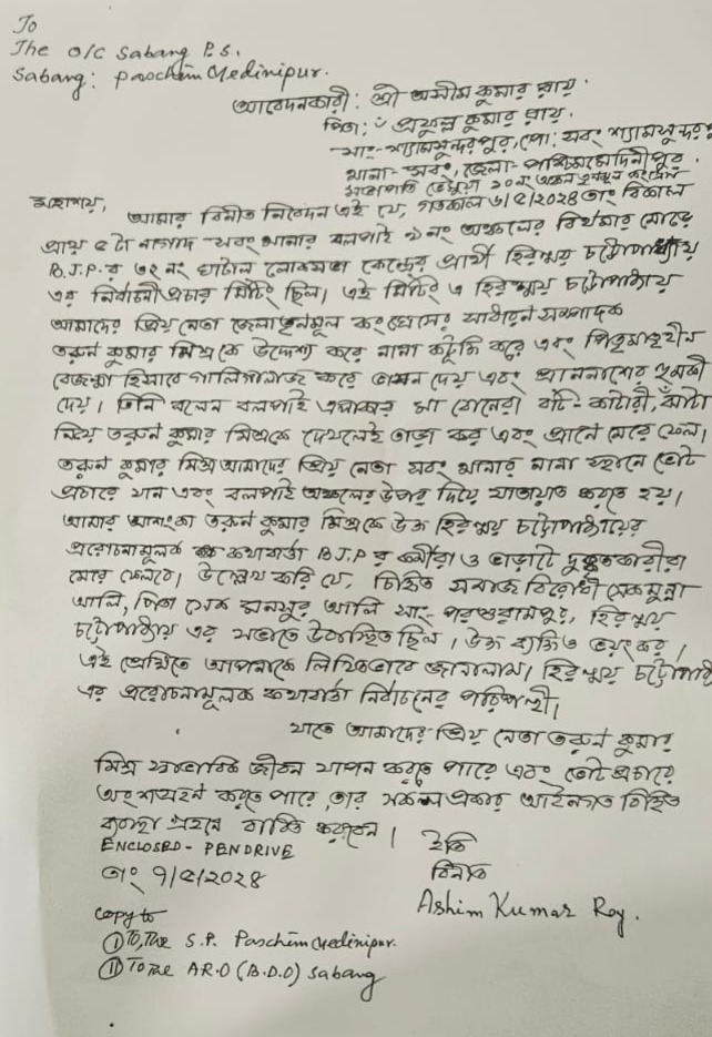সংবাদদাতা, সবং : তৃণমূলের জেলা সাধারণ সম্পাদক তথা সবং পঞ্চায়েত সমিতির পূর্ত কর্মাধ্যক্ষ তরুণ মিশ্রের পিতৃপরিচয় নিয়ে প্রশ্ন তুলে তাঁকে প্রাণনাশের হুমকি দেওয়ার অভিযোগ উঠেছে ঘাটালের বিজেপি প্রার্থী হিরণ চট্টোপাধ্যায়ের (Hiran Chatterjee) বিরুদ্ধে। নির্বাচন কমিশনের কাছে হিরণের বিরুদ্ধে এই অভিযোগ তুলে লিখিত অভিযোগের পাশাপাশি তাঁর বক্তব্যের ভিডিও পেন ড্রাইভে ভরে জমা দিয়েছেন বলপাই ৯ নম্বর অঞ্চল তৃণমূল সভাপতি মানিক মাইতি। মানিকের কথায়, ‘সোমবার বিকেলে বলপাই এলাকায় নির্বাচনী প্রচারে গিয়ে হুমকির সুরে বক্তব্য রাখেন হিরণ। আমাদের নেতার পিতামাতাকে নিয়েও প্রশ্ন তোলেন প্রকাশ্য সভায়। ওই নির্বাচনী সভার বক্তব্যের ভিডিও নির্বাচন কমিশনের কাছে অভিযোগপত্রের সঙ্গে জমা দেওয়া হয়েছে। সেখানে সভায় হিরণকে (Hiran Chatterjee) বলতে শোনা গিয়েছে, মা-বোনেরা হাতে লাঠি ঝাটা বটি কাটারি নিয়ে থাকবে আর মিশ্রর বাহিনী যদি আসে তাহলে মা-বোনেরা সামনে থাকবে, আমি থাকব সামনে। কত বড় মিশ্র তুই বাপের বেটা তোকে ওপেন চ্যালেঞ্জ দিয়ে গেলাম বলপাই মোড়ে। তুই যদি এক বাপের ব্যাটা হোস মিশ্র, যদি আমার কথা তুই শুনতে পাস, তোর যদি এক বাপ হয়, যদি জন্মের ঠিক থাকে, তুই একবার এসে ভোট লুট করে দেখ। ঠ্যাং খোঁড়া করে দেবে এবারে ৯, ১০ নম্বর অঞ্চলের মা-বোনেরা। আমি থাকব।’ এ বিষয়ে সবং ব্লক তৃণমূল সভাপতি আবু কালাম বক্স বলেন, ‘সোমবার প্রথম থানায় ঢুকে দুর্বৃত্তদের পক্ষ নিয়ে পুলিশকে হুমকি দিয়েছেন বিজেপি প্রার্থী। পরে থানা থেকে বেরিয়ে ৯ নম্বর বলপাই অঞ্চলে প্রকাশ্যে মাইকে ঘাটাল সাংগঠনিক জেলা তৃণমূলের সাধারণ সম্পাদক তরুণ মিশ্র-সহ বেশ কয়েকজন নেতার বিরুদ্ধে বলেছেন পা-হাত ভেঙে দেওয়া হবে। তাড়িয়ে এলাকাছাড়া করা হবে। এটা আসলে শুধুমাত্র ফুটেজ পাওয়া ও খবরের শিরোনামে থাকার জন্য করেছেন হিরণ। বিজেপির পক্ষে বাংলার বা মেদিনীপুর ও সবং এলাকায় কোনও মানুষই নেই। আমাদের এলাকায় যখন আসে পাশে কোনও মানুষজন থাকে না। তাই দিশেহারা হয়ে পাগলের প্রলাপ বকছেন। তৃণমূলের পক্ষ থেকে বিডিও, সবং থানা, ডিএম-সহ পুলিশ সুপারের কাছে অভিযোগ জানিয়েছি ওঁর বিরুদ্ধে ব্যবস্থা গ্রহণের জন্য।’