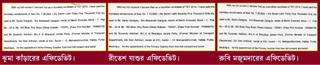 নিয়োগে বেনিয়ম নিয়ে রোজ ক্যামেরার সামনে বড় বড় ভাষণ দিচ্ছেন বিরোধী দলনেতা (BJP-Suvendu Adhikari)। এর আগে নারদায় তাঁকে ক্যামেরার সামনে টাকা নিতে দেখা গিয়েছে। সিবিআইয়ের খাতায় অভিযুক্ত হিসেবে নামও রয়েছে শুভেন্দুর। এবার টেটের তিন চাকরিপ্রার্থী শুভেন্দুর বিরুদ্ধে চাকরির প্রতিশ্রুতি দিয়ে ঘুষ নিয়েও চাকরি না দেওয়ার কথা জানালেন আদালতকে। এরপর কী বলবেন দলবদলু-ব্ল্যাকমেলার-গদ্দার শুভেন্দু? অনেক আগেই মুখ্যমন্ত্রী মমতা বন্দ্যোপাধ্যায় একাধিকবার বলেছেন, পূর্ব মেদিনীপুর-মুর্শিদাবাদ -পুরুলিয়ায় চাকরি বিক্রি করেছেন শুভেন্দু। এবার স্বয়ং চাকরিপ্রার্থীরা এফিডেভিড দিয়ে আদালতকে জানানোয় ঝোলা থেকে বেড়াল বেরিয়েই পড়ল।