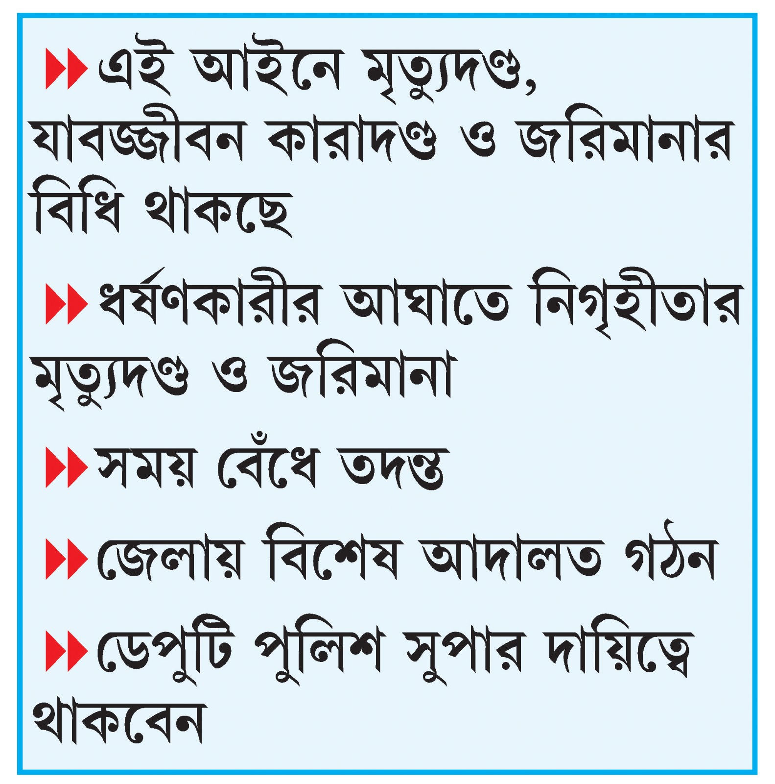 মূল আইনে কোনও থানায় ঘটনা নথিভুক্ত করার পর সেটা দুই মাসের মধ্যে তদন্ত শেষ করার কথা ছিল। সেটা ২১ দিনের মধ্যে শেষ করতে হবে সংশোধনীতে আছে। যদি কোনও ক্ষেত্রে দেখা যায় ২১ দিনে তদন্ত শেষ করতে পারছে না। সেটা ১৫ দিন অতিরিক্ত সময় দিতে পারবে। তবে সেটি জেলা পুলিশ সুপার পদমর্যাদার কাউকে দায়িত্ব দিতে হবে। ধর্ষণের শাস্তি যাবজ্জীবন কারাদণ্ড ও জরিমানা অথবা মৃত্যু। গণধর্ষণের ক্ষেত্রে জরিমানা ও আমৃত্যু কারাদণ্ড ও মৃত্যু। ধর্ষণের অভিযোগের পাশাপাশি, ধর্ষণকারীর দ্বারা আঘাতের কারণে মৃত্যু হলে অভিযুক্তের মৃত্যুদণ্ড ও জরিমানা।