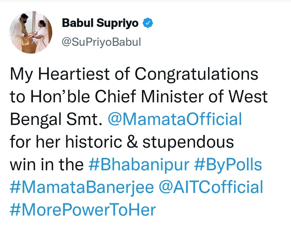 দলনেত্রী মমতা বন্দ্যোপাধ্যায়ের অভূতপূর্ব জয়ের জন্য তাঁকে অভিনন্দন জানালেন বাবুল। তিনি লেখেন, “আমার হার্দিক শুভেচ্ছা ও অভিনন্দন জানাই রাজ্যের মুখ্যমন্ত্রী মমতা বন্দ্যোপাধ্যায়কে। ভবানীপুরের উপনির্বাচনে এই ঐতিহাসিক ও বিপুল জয়ে নেত্রীকে শুভেচ্ছা।” একইসঙ্গে বাবুল হ্যাসট্যাগ দিয়ে লেখেন, ”More Power to her”.