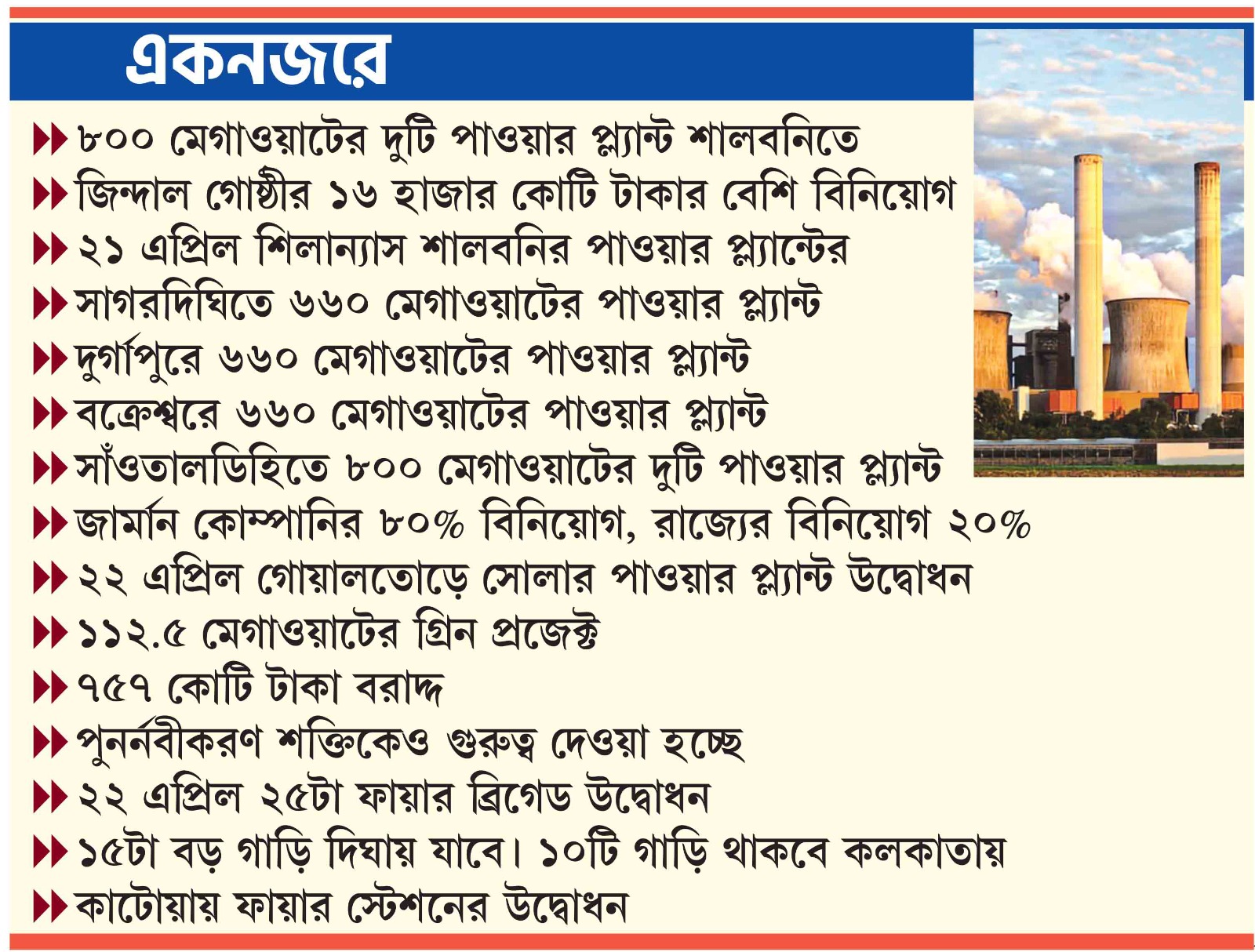 আজ বৃহস্পতিবার নবান্ন থেকে সাংবাদিকদের মুখোমুখি হন মুখ্যমন্ত্রী মমতা বন্দ্যোপাধ্যায় (Mamata Banerjee)। জানালেন রাজ্যজুড়েই বিদ্যুৎকেন্দ্রে জোর দেওয়া হচ্ছে। আগামী ২১ এপ্রিল শালবনিতে জিন্দল গোষ্ঠীর তাপবিদ্যুৎ প্রকল্পের শিলান্যাস করতে চলেছেন মুখ্যমন্ত্রী মমতা বন্দ্যোপাধ্যায়। এই মর্মে তিনি বলেন, ‘‘বিদ্যুৎকেন্দ্রে জোর দেওয়া হচ্ছে। ২১শে এপ্রিল আমি যাব শালবনিতে। শালবনিতে ৮০০ মেগাওয়াট দুটো প্ল্যান্ট হবে। ওখানে জিন্দলরা থাকবেন। মুখ্যসচিব মনোজ পন্থ যাবেন। আমরা বিদ্যুৎকেন্দ্রের শিলান্যাস করব। আর তারপরেই কাজ শুরু হয়ে যাবে। ইতিমধ্যেই অনেকগুলো পাওয়ার প্ল্যান্টের কাজ চলছে। এর মধ্যে শালবনীতে ১৬০০ মেগাওয়াট থার্মাল পাওয়ারপ্ল্যান্ট তৈরি হবে। জিন্দলরা খরচ করছেন ১৬ হাজার কোটি টাকার উপরে। কমপিটিটিভ বিডিংয়ের মাধ্যমে ওঁরা এই প্রোজেক্টের বরাত পেয়েছেন। পূর্বভারতে এমন প্রোজেক্ট আর নেই। এছাড়া ঝাড়গ্রাম -পশ্চিম মেদিনীপুরে সৌরবিদ্যুৎকেন্দ্রের উদ্বোধন করা হবে। আমরা ৬টি ইকোনোমিক করিডোর করেছি। শিল্পের নতুন গন্তব্য এখন বাংলা। সাগরদিঘি থেকে শুরু করে দুর্গাপুর, বক্রেশ্বর থেকে শুরু করে সান্তালডি প্রচুর মেগাওয়াট থার্মাল পাওয়ার প্ল্যান্টের কাজ হচ্ছে। এর ফলে আগামী দিনে অর্থনীতি অনেক মজবুত হবে, অনেক কর্ম সংস্থান হবে।” তিনি জানান, ”২২ তারিখে গড়বেতার গোয়ালতোড়ে একটি সৌরবিদ্যুৎ কেন্দ্র স্থাপন করা হবে। একটি জার্মান কোম্পানির সহায়তায়, ৭৫৭ কোটি টাকার এই গ্রিন প্রোজেক্ট হচ্ছে।”