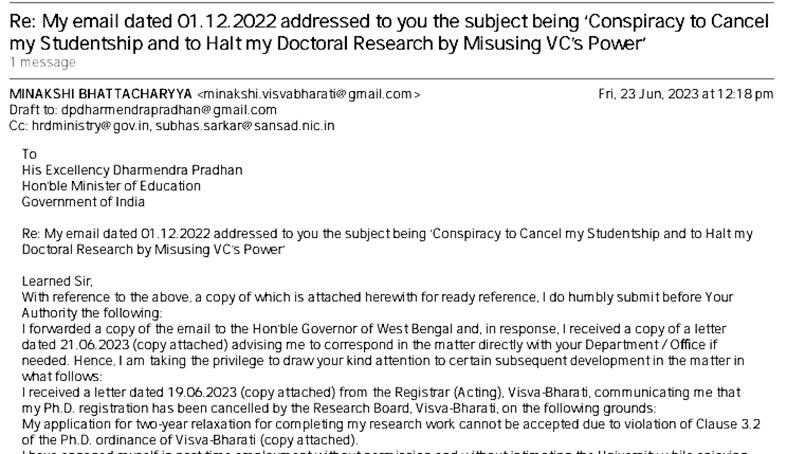 উল্লেখ্য, বিশ্বভারতীর (Visva Bharati) তৃণমূল ছাত্রছাত্রী ইউনিটের সভানেত্রী মীনাক্ষী ভট্টাচার্যকে চলতি বছরের ১৯ জুন জানানো হয়, তাঁর পিএইচডি সম্পূর্ণ করার জন্যর দুই বছরের ছাড়ের আবেদন রিসার্চ বোর্ড বাতিল করেছে বিশ্ববিদ্যালয়ের ৩.২ ধারা অনুযায়ী। মীনাক্ষী দিল্লির কাউন্সিল অফ ফিলোজফিক্যাল রিসার্চ থেকে ফেলোশিপ নিয়ে আংশিক কর্মী হিসেবে নিযুক্ত আছেন। বিদ্যাভবনের অধ্যক্ষ তথা ইতিহাসের অধ্যাপিকা বিপাশা রাহাকে দর্শন ও তুলনামূলক ধর্ম বিভাগের প্রধান করা নিয়ে প্রশ্ন তোলেন উপাচার্যকে। তারপরই মীনাক্ষী কেন্দ্রীয় শিক্ষামন্ত্রী ধর্মেন্দ্র প্রধানকে চিঠি লিখে জানান, বিশ্বভারতীর ভারপ্রাপ্ত কর্মসচিব তাঁর পিএইচডি রেজিস্ট্রেশন বাতিল করে যে চিঠি দিয়েছেন তাতে ভুল তথ্য রয়েছে। একজন মহিলা হিসেবে পিএইচডি সম্পূর্ণ করার জন্য সময়সীমার ক্ষেত্রে রিলাক্সসেশনে দুই বছরের ছাড় চাওয়া হয় পিএইচডি অর্ডিন্যান্সের ৩.৩ ধারায়। কিন্তু মীনাক্ষীর ক্ষেত্রে ৩.২ ধারার উল্লেখ করা হয়েছে। যা সম্পূর্ণ ভুল। তাছাড়া মীনাক্ষীর বক্তব্য শোনা বা আত্মপক্ষ সমর্থনে কোনও সুযোগ না দিয়ে স্বৈরাচারী আচরণ করা হয়েছে। এছাড়াও মীনাক্ষীর পিএইচডি সুপারভাইজর দর্শন বিভাগের অধ্যাপক ড. শুভ্রজ্যোতি দাসকে সাসপেন্ড করা হয়। যা কলকাতা হাইকোর্ট ২১ মে বাতিল করে তাঁকে কাজে যোগ দেওয়ার ব্যাপারে নির্দেশ দিয়েছে বিশ্বভারতীকে। মীনাক্ষী বিশ্বভারতীর তৃণমূল ছাত্রছাত্রী ইউনিটের সভানেত্রী হলেও একজন ছাত্রী। তাঁর প্রতি বিশ্বভারতী কর্তৃপক্ষের এহেন আচরণে ক্ষুব্ধ শিক্ষা মহল। বিভিন্ন সময়ে বিশ্বভারতীতে বর্তমান উপাচার্যের গৈরিকীকরণের বিরুদ্ধে মীনাক্ষী সোচ্চার হন। সেই কারণে এই প্রতিহিংসা বলে দাবি করেন অনেকেই।