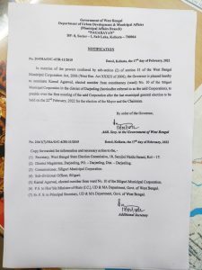 রিতিশা সরকার, শিলিগুড়ি: আগামী ২২ ফেব্রুয়ারি শিলিগুড়ি পুর বোর্ড গঠন হতে চলেছে। ভোট গণনার তিনদিন পরে রাজ্য সরকারের পুরনগর উন্নয়ন দফতর বিজ্ঞপ্তি জারি করেছে। মেয়র হিসাবে ঘোষিত হয়েছেন গৌতম দেব। বৃহস্পতিবার বিকেলে শিলিগুড়ি পুর কর্পোরেশনে বোর্ড গঠনের বিজ্ঞপ্তি এসে পৌঁছয়। বোর্ড গঠনের যে পদ্ধতিগত প্রথম মিটিং তা পরিচালনা করবেন ১০ নম্বর ওয়ার্ডের তৃণমূল কাউন্সিলর কমল আগরওয়াল। এদিনই মেয়র হিসেবে শপথ নেবেন গৌতম দেব।