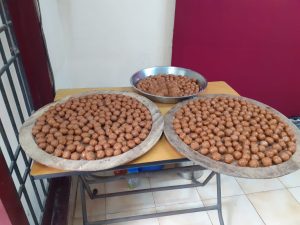সংগঠনের সহ সভাপতি তথা পুজো কমিটির আহ্বায়ক দেবাশিস মুখোপাধ্যায়ের তত্ত্বাবধানে নাড়ু বানাতে হাত লাগান সংগঠনের সদস্যরা। আগে প্রায় ৩০০ নারকেলের নাড়ু হত। এখন এখনো করোনা বিধিনিষেধ থাকায় সেই সংখ্যাটা কমেছে। এবছর ১০০ নারকেলের নাড়ু বানানো হয়েছে।