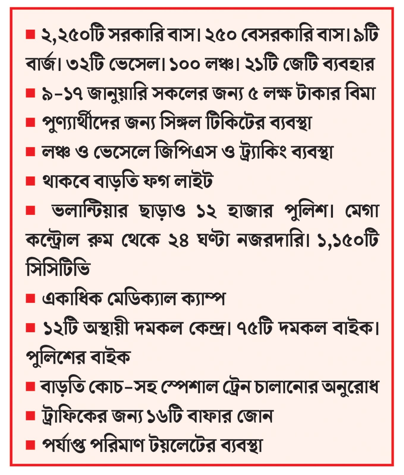 প্রতিবেদন : গঙ্গাসাগর (Gangasagar) মেলার মেগা প্রস্তুতি-বৈঠক সারলেন মুখ্যমন্ত্রী মমতা বন্দ্যোপাধ্যায়। গঙ্গাসাগর মেলাকে কেন্দ্র করে একাধিক প্রস্তুতি নিয়েছে রাজ্য সরকার। গোটা বিষয়টি নিজেই মনিটর করছেন মুখ্যমন্ত্রী। তবে বিরাট এই মেলার সুষ্ঠু আয়োজনের জন্য পুলিশ-প্রশাসন এবং মন্ত্রীদের দায়িত্ব ভাগ করে দিয়েছেন। এদিন নবান্ন সভাঘরে রাজ্য সরকারের ১৭টি দফতরের মন্ত্রী, সচিব-সহ অফিসারদের নিয়ে বৈঠক করেন মুখ্যমন্ত্রী। উপস্থিত ছিলেন রেল, বিএসএনএল, নেভি এবং পোর্টের কর্তারাও। গঙ্গাসাগর মেলার বৈঠকে এদিনও কেন্দ্রীয় সরকারের বঞ্চনার কথা তুলেন ধরেন মুখ্যমন্ত্রী। তিনি বলেন, কুম্ভ মেলাকে জাতীয় মেলার তকমা দেওয়া হয়েছে। তাতে আমাদের আপত্তি নেই। কিন্তু বহুবার বলার পরেও গঙ্গাসাগর মেলাকে জাতীয় মেলার তকমা দেওয়া হয়নি। কেন্দ্র এই মেলার কোনও টাকা দেয় না। পুরোটাই রাজ্য সরকার খরচ করে। তিনি বলেন, ফের একবার চিঠি যাবে জাতীয় মেলার স্বীকৃতির জন্য। পুণ্যার্থী ও স্থানীয় বাসিন্দাদের সুবিধার্থে মুড়ি গঙ্গার উপরে সেতু নির্মাণ করবে রাজ্য সরকার। যার সার্ভে এবং ডিপিআর হয়ে গিয়েছে। মুখ্যমন্ত্রী জানিয়েছেন, ৫ কিলোমিটার দীর্ঘ ৪ লেনের এই সেতু তৈরির খরচ দেড় হাজার কোটি টাকা। সেতুটি সম্পূর্ণ হতে ৪ বছর সময় লাগবে। এর নাম তিনি দিয়েছেন ‘গঙ্গাসাগর সেতু’। মেলায় মেগা কন্ট্রোল রুম থেকে পর্যাপ্ত পরিমাণে ভেসেল, বার্জ, লঞ্চ, সিসিটিভি, দমকল, গাড়ি, মেডিক্যাল ক্যাম্প, পর্যাপ্ত ডাক্তার, মেলায় অংশগ্রহণকারীদের সকলের জন্য ৫ লক্ষ টাকার বিমা— সবই ব্যবস্থা করা হয়েছে।