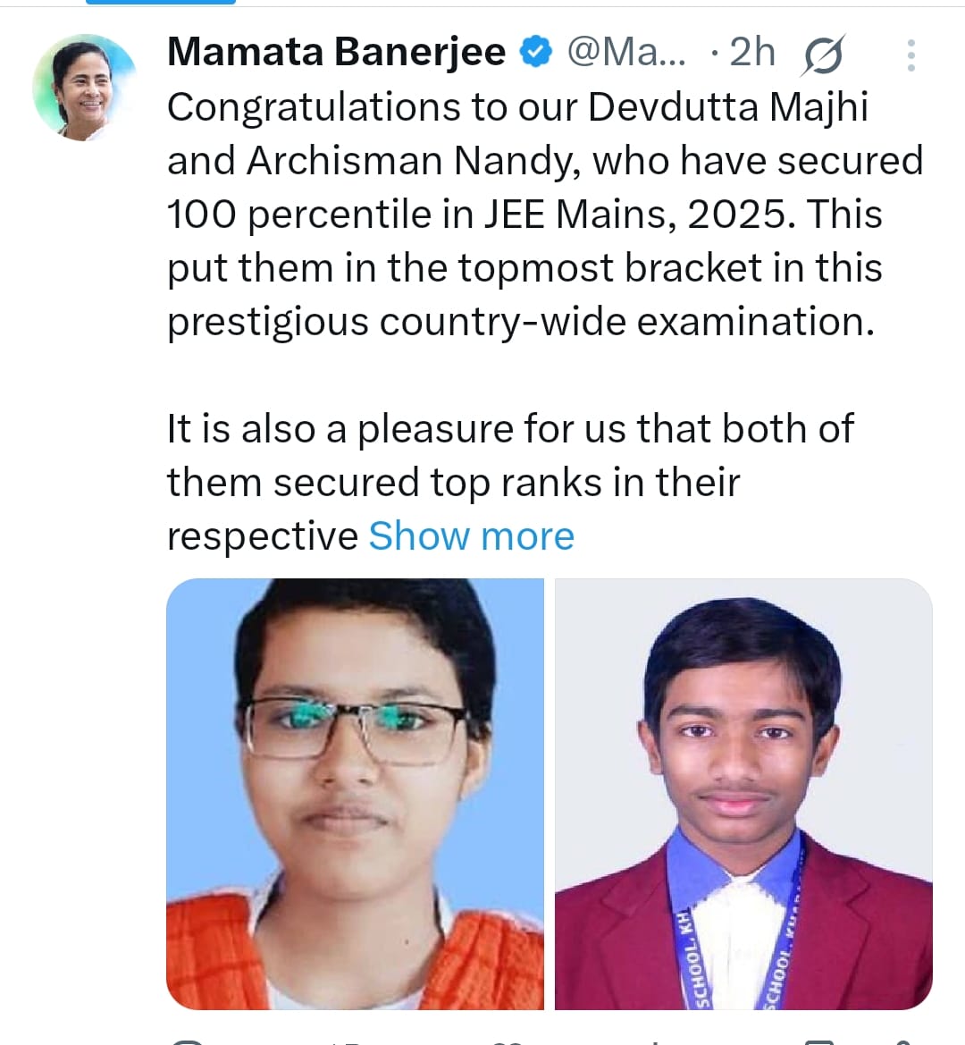 এক্স হ্যান্ডেলে মুখ্যমন্ত্রী লেখেন, ২০২৫ জেইই মেইন পরীক্ষায় দেবদত্তা মাজি ও অর্চিষ্মান নন্দী ১০০ শতাংশ নম্বর পাওয়ায় তাঁদের অভিনন্দন। এই সাফল্য দেশব্যাপী হওয়া সম্মানজনক এই পরীক্ষায় তাঁদের প্রথম সারিতে তুলে দিয়েছে। সেই সঙ্গে এটাও সুখের কথা যে এই দু’জনেই ২০২৩ সালের দশম শ্রেণির পরীক্ষায় নিজেদের বোর্ডে সর্বোচ্চ স্থান অর্জন করেছিল। এই দুই কৃতীকেই ১ জুন ২০২৪-এ বিশ্ববাংলা মেলা প্রাঙ্গণে আমি সংবর্ধিত করেছিলাম।