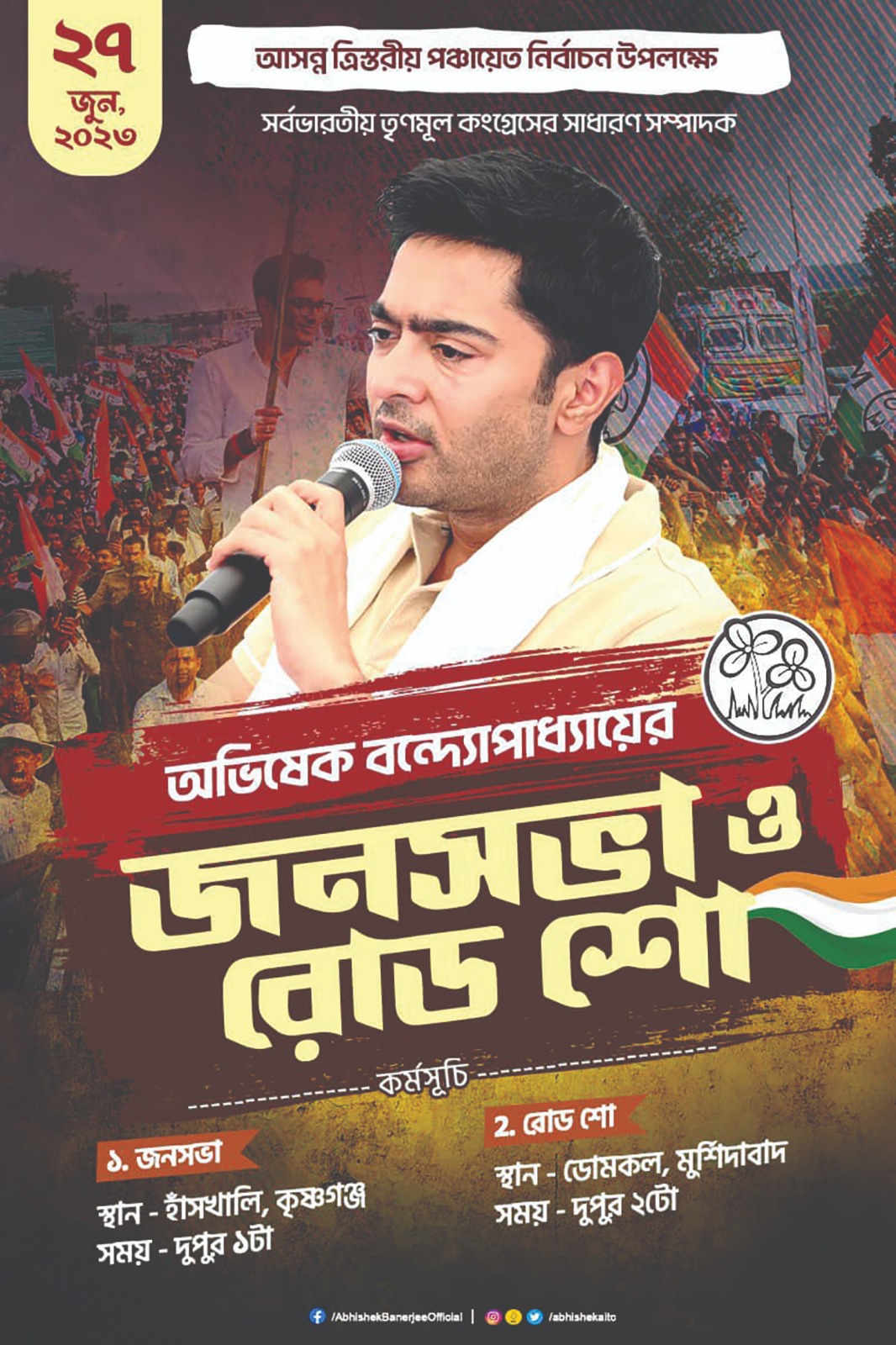 প্রতিবেদন : আজ, সোমবার কোচবিহার থেকে পঞ্চায়েত নির্বাচনের (Panchayat Election) প্রচার শুরু করছেন দলনেত্রী মমতা বন্দ্যোপাধ্যায়। আজ কোচবিহার দক্ষিণের চান্দামারি প্রাণনাথ হাইস্কুল মাঠে জনসভা করবেন তিনি। পরদিন, মঙ্গলবার জলপাইগুড়িতেও সভা রয়েছে মমতা বন্দ্যোপাধ্যায়ের (Mamata Banerjee)। ওইদিন থেকে প্রচারে নামছেন অভিষেক বন্দ্যোপাধ্যায়ও (Abhishek Bnaerjee)। নদিয়া থেকে পঞ্চায়েতের (Panchayat Election) প্রচার শুরু করবেন দলের সর্বভারতীয় সাধারণ সম্পাদক। ওইদিন দুপুর ১টায় হাঁসখালিতে জনসভা করবেন তিনি। এরপর দুপুর ২টোয় মুর্শিদাবাদের ডোমকলে রোড-শো রয়েছে তাঁর। এরপর টানা বর্ধমান, বীরভূম, আলিপুরদুয়ার, দক্ষিণ দিনাজপুর, মালদা, পুরুলিয়া, বাঁকুড়া, পশ্চিম মেদিনীপুর, পূর্ব মেদিনীপুরে প্রচারে যাবেন তিনি। একদিকে জননেত্রী মমতা বন্দ্যোপাধ্যায়, অন্যদিকে অভিষেক বন্দ্যোপাধ্যায় বাংলা জুড়ে প্রচার করবেন। এর সঙ্গে আগে থেকেই দলের ৫৮ জন রাজ্যস্তরের নেতা-নেত্রী ইতিমধ্যেই রাজ্য জুড়ে প্রচারে নেমে পড়েছেন। সব মিলিয়ে আগামী দু’সপ্তাহ বাংলার যেদিকে তাকানো যাক না কেন চারিদিকে শুধুই তৃণমূল-ঝড় ছাড়া আর কিছু চোখে পড়বে না।