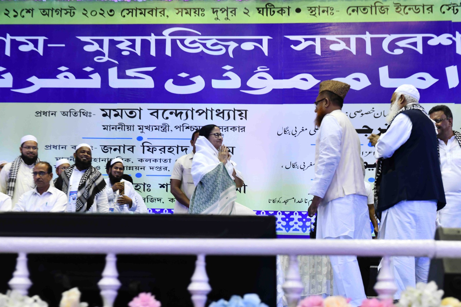 কেন্দ্রের লাগাতার আর্থিক বঞ্চনার কারণে সঙ্কটে রাজ্য। তা স্বত্বেও দীর্ঘদিনের দাবি পূরণ করে রাজ্যের ইমাম-মোয়াজ্জেমদের পাশে দাঁড়ালেন মুখ্যমন্ত্রী মমতা বন্দ্যোপাধ্যায়। এক দশক পর রাজ্যে ইমাম-মোয়াজ্জেম-পুরোহিতদের ভাতা বাড়ানোর কথা ঘোষণা করেছেন তিনি। তাঁদের মাসিক ভাতা আড়াই হাজার থেকে ৫০০ টাকা বাড়িয়ে তিন হাজার টাকা করা হচ্ছে। কলকাতার নেতাজি ইনডোর স্টেডিয়ামে সোমবার ইমাম-মোয়াজ্জেম (Imam Allowance) সমাবেশে অংশ নিয়ে মুখ্যমন্ত্রী বলেন, কেন্দ্রীয় ঋণ ও আর্থিক বঞ্চনার কারণে রাজ্য সরকারের সাধ থাকলেও সাধ্য নেই। তাও সরকার যথাসম্ভব সংখ্যালঘুদের পাশে দাঁড়িয়েছে। ভাতার পাশাপাশি ইমাম-মোয়াজ্জেম বা তাঁদের পরিবারের কোনও সদস্য ব্যবসা করে স্বনির্ভর হতে চাইলে ভবিষ্যৎ ক্রেডিট কার্ড প্রকল্পের আওতায় ৫ লক্ষ টাকা পর্যন্ত সরকারি গ্যারান্টিতে ঋণ দেওয়া হবে বলে মুখ্যমন্ত্রী জানিয়েছেন।