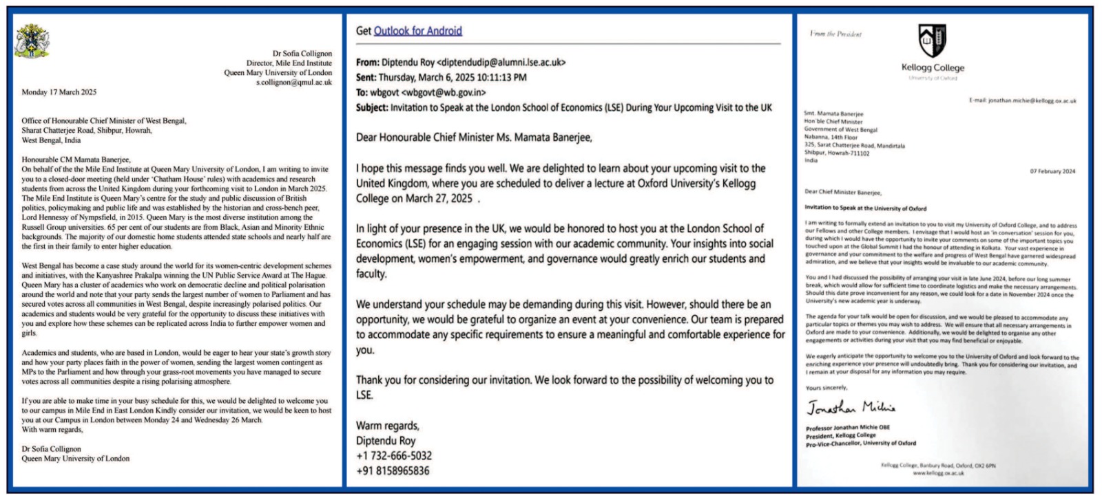 অক্সফোর্ড বিশ্ববিদ্যালয়ের অধীনস্থ কেলগ কলেজের পর পর কুইন মেরি ইউনিভার্সিটি অফ লন্ডন ও লন্ডন স্কুল অফ ইকোনমিক্সে বক্তৃতা দেওয়ার আমন্ত্রণ জানিয়ে নবান্নে চিঠি এসেছে। আগামী ২১ মার্চ ব্রিটেন যাচ্ছেন মুখ্যমন্ত্রী। ঠাসা কর্মসূচির মাঝে নতুন করে কোথায় তিনি বক্তৃতা দেবেন, তা এখনও সুস্পষ্ট নয়।