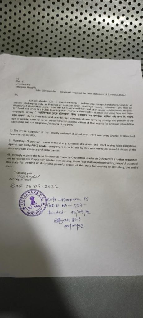 সুমন করাতি, হুগলি : রাজ্যের বিরোধী দলনেতা শুভেন্দু অধিকারীর (Suvendu Adhikari) বিরুদ্ধে উত্তরপাড়া থানায় অভিযোগ দায়ের করলেন কানাইপুর গ্রামপঞ্চায়েত প্রধান আচ্ছেলাল যাদব। উত্তরপাড়াতেই বিজেপির এক সভায় শুভেন্দু (Suvendu Adhikari) তাঁকে সরাসরি চোর ও সবচেয়ে বেশি দুর্নীতিগ্রস্ত বলে আক্রমণ করেন। শুভেন্দুর এই অবমাননাকর বক্তব্যের বিরুদ্ধেই উত্তরপাড়া থানায় অভিযোগ দায়ের করেন আচ্ছেলাল। বলেন, বিরোধী দলনেতা তাঁর বিরুদ্ধে যে কথা বলেছেন, তা সম্পূর্ণ মিথ্যা ও সম্মানহানিকর। রাজনীতিতে শুভেন্দু হয়তো তাঁকে সব থেকে বড় প্রতিদ্বন্দ্বী বলে মনে করেন। হুগলি জেলায় বিজেপির কোনও সংগঠন নেই, তাই বিজেপি কর্মীদের চাঙ্গা করতে শুভেন্দু বিভিন্ন জায়গায় এসে তৃণমূল নেতাদের বিরুদ্ধে মিথ্যা কথা বলে বদনাম করার চেষ্টা করছেন। আচ্ছেলাল শুভেন্দুকে হুঁশিয়ারি দিয়ে আরও বলেন, শুভেন্দু তাঁর বিরুদ্ধে বিজেপির সভায় যে কথাগুলি বলেছেন, তা প্রমাণ করতে হবে ওঁকে। আগামী দিনে মানহানির মামলা করার হুঁশিয়ারিও দেন আচ্ছেলাল।