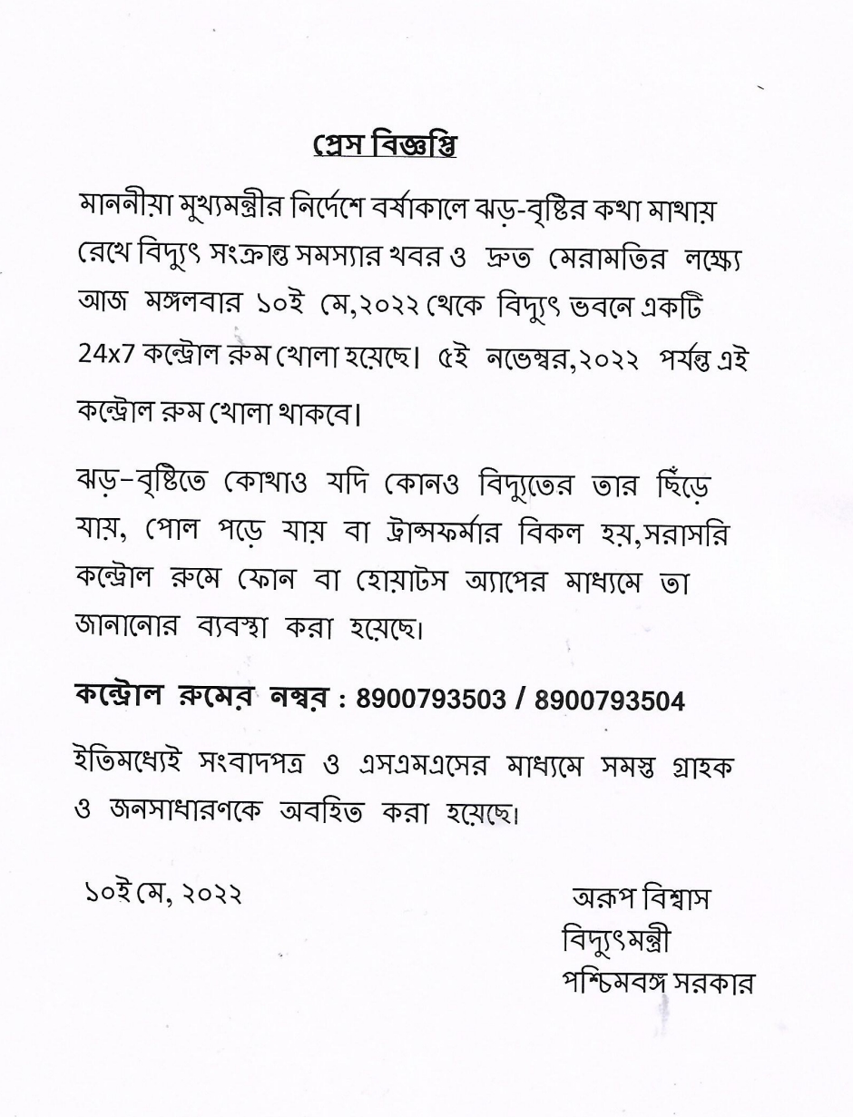 বিদ্যুৎ সংক্রান্ত সমস্যার খবর ও দ্রুত মেরামতির কারণে বিদ্যুৎ ভবনে (Electricity Building) খোলা হল ২৪×৭ কন্ট্রোল রুম। কন্ট্রোল রুমের (Control Room) দুটি নম্বর রয়েছে। ৮৯০০৭৯৩৫০৩, ৮৯০০৭৯৩৫০৪।