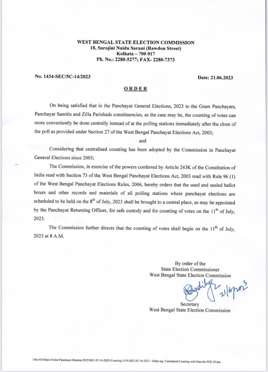 প্রতিবেদন : আসন্ন পঞ্চায়েত নির্বাচনের গণনা (Panchayat Election Counting) এবার কেন্দ্রীভুত করার সিদ্ধান্ত নিল রাজ্য নির্বাচন কমিশন। এর ফলে এবার পঞ্চায়েত সমিতি, গ্রাম পঞ্চায়েত এবং জেলা পরিষদের গণনা একসঙ্গে হবে বলে কমিশন সূত্রে জানা গিয়েছে। বৃহস্পতিবার কমিশনের তরফে নির্দেশিকা জারি করে জানানো হয়েছে, আগামী ১১ জুলাই সকাল ৮টায় পঞ্চায়েতের ভোট গণনা (Panchayat Election Counting) শুরু হবে। আগে ত্রিস্তর পঞ্চায়েতের ভোট গণনা আলাদা আলাদা ভাবে সম্পন্ন করা হত। কমিশন সূত্রে খবর, কেন্দ্রীভূত গণনা হলে সময় বাঁচবে এবং ফল ঘোষণার প্রক্রিয়াও সহজ হবে। রাজ্য নির্বাচন কমিশন সূত্রে খবর, পশ্চিমবঙ্গ পঞ্চায়েত নির্বাচন আইনের ২৭ নম্বর ধারা অনুসারে এবার কেন্দ্রীভূত ভাবে ভোট গণনার সিদ্ধান্ত নেওয়া হয়েছে। ইতিমধ্যেই সমস্ত জেলাকে এই মর্মে নির্দেশিকা পাঠিয়েছে কমিশন। সমস্ত জেলা নির্বাচনী আধিকারিককে সেভাবেই প্রস্তুতি নিতে বলা হয়েছে। উপযুক্ত জায়গা চিহ্নিত করতে তাঁদের নির্দেশ দেওয়া হয়েছে। বলা হয়েছে, নির্বাচন সম্পূর্ণ হওয়ার সঙ্গে সঙ্গে সিল করা ব্যালট বাক্স ও ভোটকেন্দ্রের রেকর্ড কেন্দ্রীভূত ভাবে একটি নির্দিষ্ট জায়গায় জমা করতে হবে। পশ্চিমবঙ্গ পঞ্চায়েত নির্বাচন আইন ২০০৩ অনুযায়ী এই নির্দেশিকা বলবৎ হবে ।