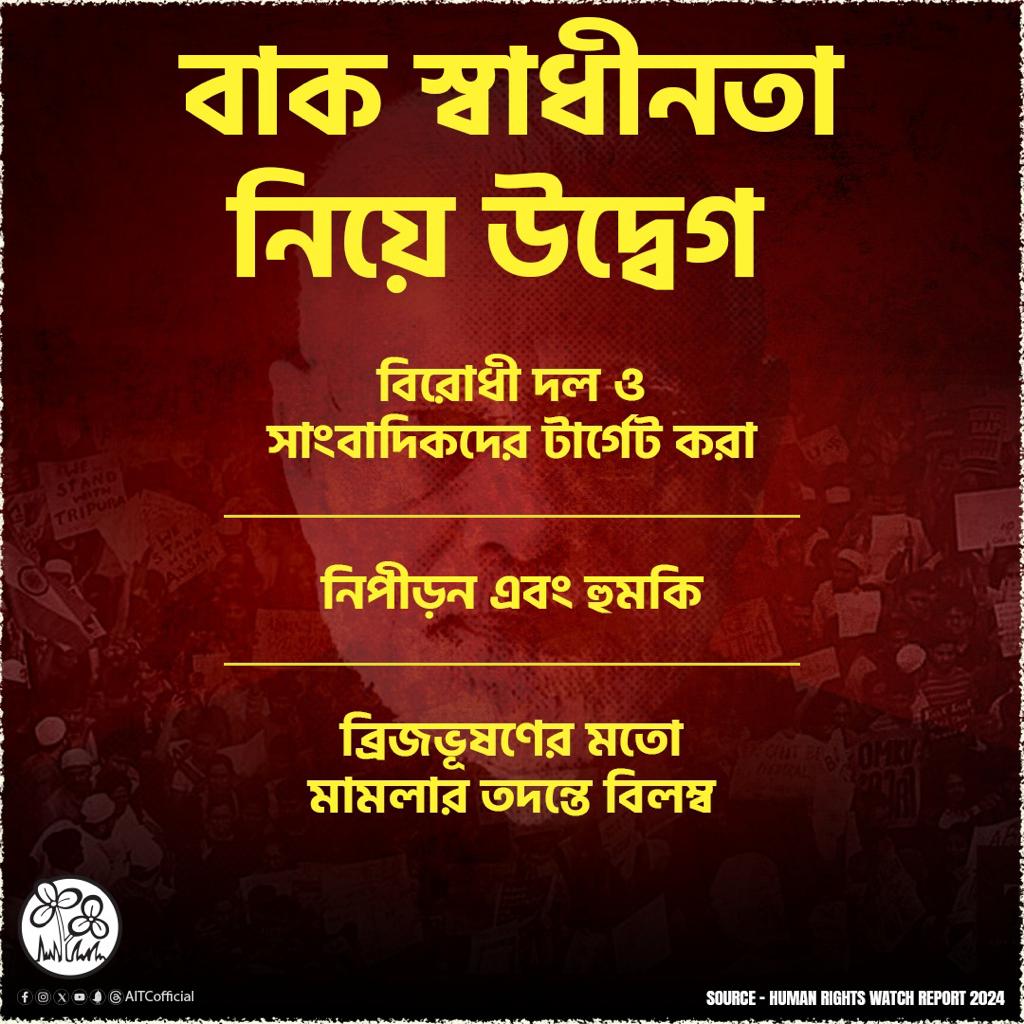 দেশে বাক-স্বাধীনতার পরিস্থিতি নিয়েও উদ্বেগ প্রকাশ করেছে তৃণমূল। বিজেপিকে আক্রমণ করে মমতা বন্দ্যোপাধ্যায়ের দলের অভিযোগ, বিরোধী দল ও সাংবাদিকদের বেছে বেছে ‘টার্গেট’ করছে বিজেপি। রাজনৈতিক প্রতিহিংসা মেটাতে বিরোধীদের মিথ্যা মামলায় হেনস্থা করা মোদি জমানায় রুটিন কাজে পরিণত হয়েছে। মহিলাদের উপর আক্রমণ ও নির্যাতনের ঘটনা বেড়ে চলেছে এই জমানায়। অপরাধীদের সঙ্গে হাত মিলিয়ে কীভাবে বিজেপি সরকার ধর্ষক ও খুনিদের রক্ষা করে তা বিলকিস বানো মামলাতেই ফাঁস করে দিয়েছে দেশের সুপ্রিম কোর্ট। নারীর উপর অত্যাচার দেখেও কেন্দ্রের বিজেপি সরকার কীভাবে নিষ্ক্রিয় থাকে তার প্রমাণ বিজেপি সাংসদ ব্রিজভূষণের ইস্যু। আন্তর্জাতিক ক্রীড়াক্ষেত্রে পদকজয়ী সোনার মেয়েদের উপর যৌন নির্যাতনের অভিযোগ ওঠার পরেও নির্বিকার মোদি সরকার। মহিলাদের অবমাননা আর নিগ্রহকারীদের সমর্থন এই জমানার পরিচিত ছবি। এর পাশাপাশি বিজেপির শাসনে দেশে যে সাম্প্রদায়িক হিংসা ও জাতিগত দাঙ্গার ঘটনা কয়েকগুণ বেড়ে গিয়েছে তার বিরুদ্ধেও সোচ্চার হয়েছে তৃণমূল কংগ্রেস। বিজেপি শাসনকালেই হরিয়ানায় নূহতে হিংসার ঘটনা ঘটেছে। যেখানে সাম্প্রদায়িক বিদ্বেষ ও প্রতিহিংসা মেটানোর মনোভাব নিয়ে বহু সংখ্যালঘু পরিবারের উপর দমন-পীড়ন ও প্রতিশোধ নেওয়ার ঘটনা ঘটেছে।