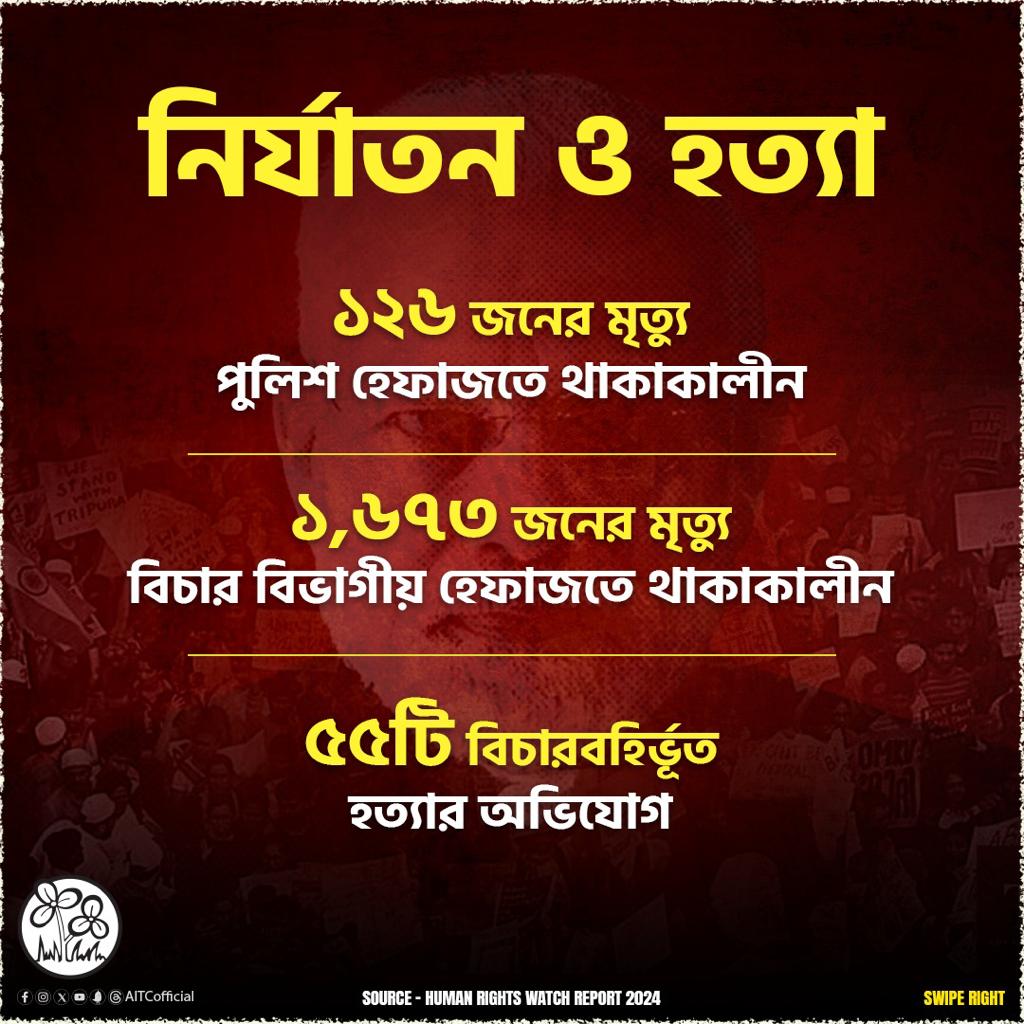 বিজেপিকে আক্রমণ করে তৃণমূলের অভিযোগ, দেশে বিজেপি শাসনে পুলিশি হেফাজতে মোট ১২৬ জনের মৃত্যু হয়েছে, যা চরম উদ্বেগের। এটি মানবাধিকার লঙ্ঘনের ভয়াবহ অবস্থার সূচক। পাশাপাশি বিচারবিভাগীয় হেফাজতে থাকাকালীন ১৬৭৩ জনের মৃত্যু হয়েছে এই মোদি জমানায়। এছাড়াও ৫৫টি বিচারবিভাগ বহির্ভূত মৃত্যুর ঘটনা ঘটেছে।