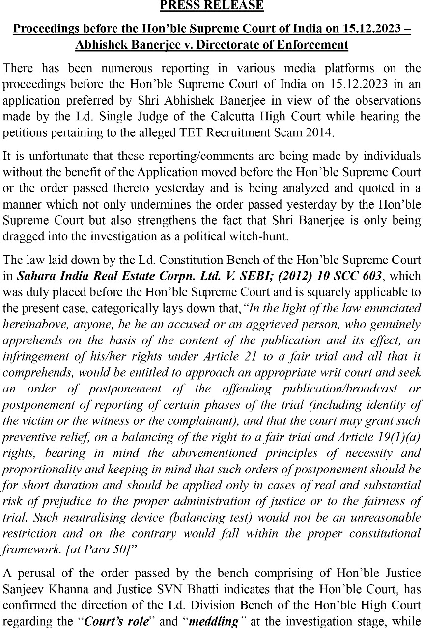 প্রতিবেদন : তৃণমূল কংগ্রেসের সর্বভারতীয় সাধারণ সম্পাদক অভিষেক বন্দ্যোপাধ্যায়ের মামলায় সুপ্রিম কোর্টের নির্দেশনামা লিখিত আকারে আপলোড হতেই স্পষ্ট হয়ে গেল আসলে শীর্ষ আদালত এই মামলায় ঠিক কী বলতে চেয়েছে। এখন স্পষ্ট বোঝা যাচ্ছে অভিষেক বন্দ্যোপাধ্যায় ও তৃণমূল কংগ্রেসকে কালিমালিপ্ত করতেই শীর্ষ আদালতের রায়ের ভুল ব্যাখ্যা করা হয়েছে।