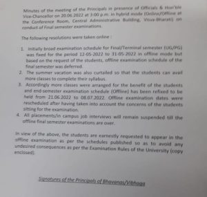 পরীক্ষা পিছল একদিন। বয়কটের জেরে বিশ্বভারতী এক প্রেস বিজ্ঞপ্তিতে জানাল, ২১ জুন থেকে ফের পরীক্ষার দিনস্থির হল। চলবে ৮ জুলাই পর্যন্ত। বিশ্বভারতী জানায়, চলতি বছরের ১২ থেকে ৩১ মার্চ পর্যন্ত অফলাইন পরীক্ষার দিনস্থির ছিল। পড়ুয়াদের অনুরোধে পরীক্ষার দিন পিছোয়। সেই সঙ্গে গ্রীষ্মের ছুটি কমিয়ে দেওয়া হয় এবং সিলেবাস সম্পূর্ণ করতে অতিরিক্ত ক্লাস নেওয়া হয়। পরীক্ষার্থীদের আন্তরিকভাবে অনুরোধ করা হয় পরিবর্তিত তারিখে পরীক্ষা দিতে।