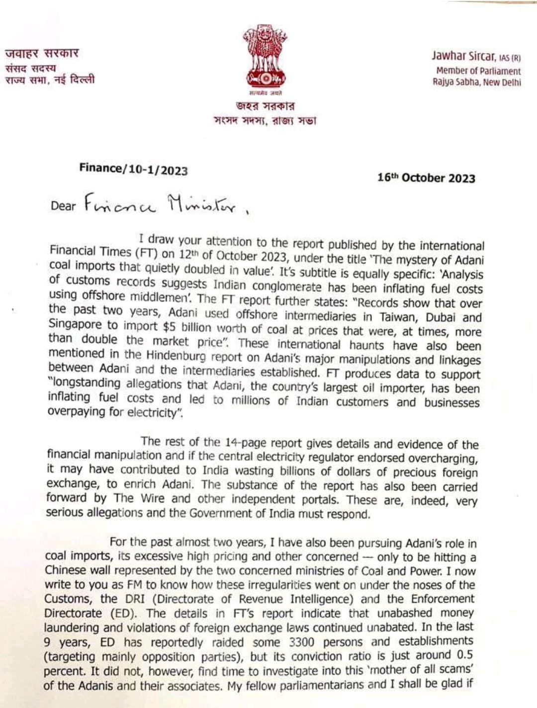 বিগত প্রায় দুবছর ধরে কয়লা আমদানির ক্ষেত্রে আদানির ভূমিকার কথা আমি নিজে তুলে ধরার চেষ্টা করেছি। বলার চেষ্টা করেছি, অতিরিক্ত দাম বাড়ানো-সহ নানাবিধ কারণে কয়লা ও বিদ্যুৎক্ষেত্রের মতো দুটো গুরুত্বপূর্ণ বিষয় ক্ষতিগ্রস্ত হচ্ছে। শুল্কবিভাগ, ডিরেক্টর অব রেভেনিউ ইনটেলিজেন্স এবং ইডি (এনফোর্সমেন্ট ডিরেক্টরেট)-এর নাকের ডগায় এসব অপকর্ম চলছে। ফিনান্সিয়াল টাইমস-এর প্রতিবেদন থেকে স্পষ্ট বোঝা যাচ্ছে বিদেশি মুদ্রা বিনিময়ের বিধিভঙ্গ হয়েছে এসব লেনদেনে। গত ন-বছরে ইডি ৩,৩০০ ব্যক্তি ও সংস্থার বিরুদ্ধে অভিযোগ দায়ের করেছে মূলত অ-বিজেপি দলগুলিকে ফাঁসানোর লক্ষ্যে, তবে মাত্র ০.৫ শতাংশ মামলায় দোষপ্রমাণে বা দোষী সাব্যস্তকরণে সফল হয়েছে। কিন্তু কী আশ্চর্যের বিষয়, আদানি এবং সঙ্গীসাথীদের বিরুদ্ধে কোনও তদন্তেই আগ্রহ দেখায়নি তারা।