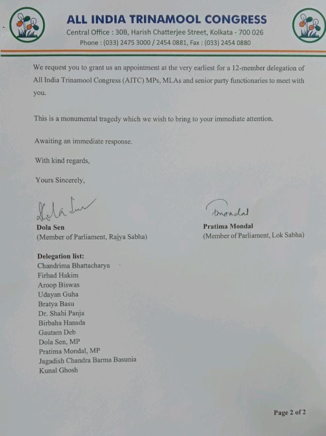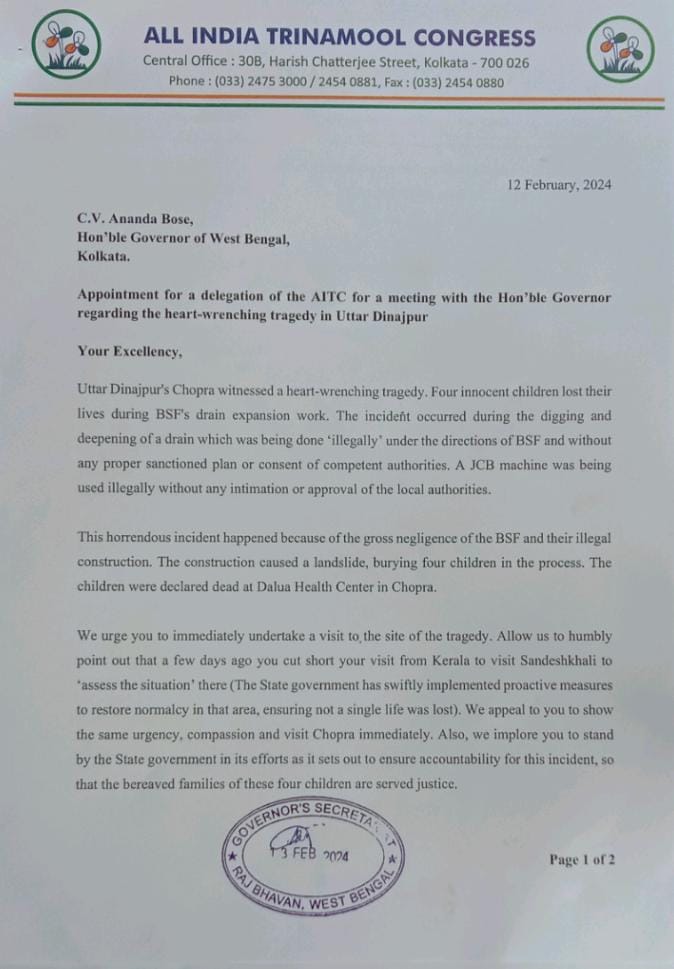 চোপড়ার মর্মান্তিক ঘটনায় বিধায়ক, সাংসদ মিলিয়ে তৃণমূল কংগ্রেস ১২জন সদস্যের একটি প্রতিনিধি দল গঠন করল। তৃণমূল কংগ্রেস শীর্ষ নেতৃত্ব এলাকায় প্রতিনিধি দল পাঠাচ্ছে। সেই দলে রয়েছেন চন্দ্রিমা ভট্টাচার্য, ফিরহাদ হাকিম, অরূপ বিশ্বাস, উদয়ন গুহ, ব্রাত্য বসু, ডঃ শশী পাঁজা, বীরবাহ হাঁসদা, গৌতম দেব, দোলা সেন, প্রতিমা মন্ডল, জগদীশ চন্দ্র বর্মা, কুণাল ঘোষ। জানা গিয়েছে তারা রাজ্যপাল সিভি আনন্দ বোসের সঙ্গেও সাক্ষাতের জন্য সময় চেয়ে ইতিমধ্যেই চিঠি দিয়েছেন। আগামী ১৫ই ফেব্রুয়ারি দুপুর ১২টায় তৃণমূল কংগ্রেস সদস্যদের সঙ্গে এই মর্মে আলোচনায় বসবেন রাজ্যপাল| উল্লেখ্য, বিএসএফ সীমান্ত রক্ষার জন্য এই ড্রেন তৈরী করছে। কিন্তু এই মর্মান্তিক দুর্ঘটনা তদন্ত সাপেক্ষ। পুলিশের সঙ্গে সঙ্গে বিএসএফও এই ঘটনার বিভাগীয় তদন্ত করবে।
