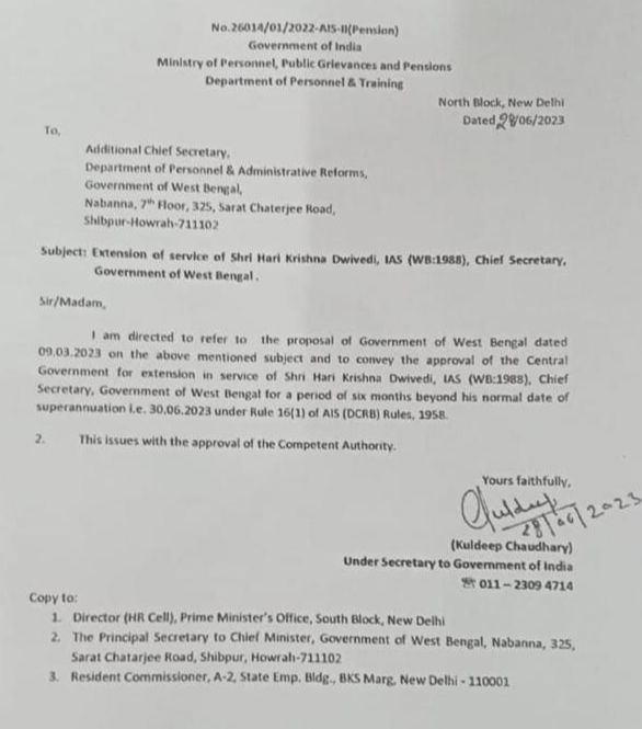 করোনার প্রকোপের মধ্যেই ২০২১ সালে আলাপন বন্দ্যোপাধ্যায়ের স্থলাভিষিক্ত হয়েছিলেন হরিকৃষ্ণ দ্বিবেদী (Harikrishna Dwivedi)। তাঁর আগে তিনি রাজ্যের স্বরাষ্ট্রসচিব ছিলেন। বর্তমান সরকারের প্রথম থেকেই তিনি দীর্ঘ সময় অর্থ দফতরের সচিব হিসেবে দক্ষতার সঙ্গে কাজ করেছেন। তৎকালীন অর্থমন্ত্রী অমিত মিত্রের যোগ্য সহযোগী হিসেবে বাম আমলের ঋণগ্রস্থ রাজ্যকে উন্নয়নের নতুন দিশা দেখাতে গুরুত্বপূর্ণ ভূমিকা নিয়েছিলেন হরিকৃষ্ণ দ্বিবেদী। কোষাগারে আয় বাড়িয়ে ঋণ ও সুদ মেটানোর ব্যবস্থা করার পাশাপাশি কন্যাশ্রী, রূপশ্রী, সবুজ সাথীর মতো একাধিক নতুন জনমুখী প্রকল্পে অর্থ যোগানোর চ্যালেঞ্জ সামলেছেন দক্ষ হাতে। বিশ্ববঙ্গ বাণিজ্য সম্মেলনের আয়োজন করার ক্ষেত্রেও তিনি ছিলেন পুরোধা ব্যক্তি। প্রচার বিমুখ এই আমলা নিজের কর্মদক্ষতাতেই মুখ্যমন্ত্রীসহ প্রশাসনের সর্বস্তরের আস্থাভাজন হয়ে উঠেছেন। সেকারণেই এখনই তাঁকে ছেড়ে দিতে নারাজ মুখ্যমন্ত্রী কেন্দ্রের সঙ্গে কার্যত লড়াই করে তাঁর মেয়াদ বাড়ানোর সিদ্ধান্তে অনুমোদন আদায় করতে সফল হয়েছেন।