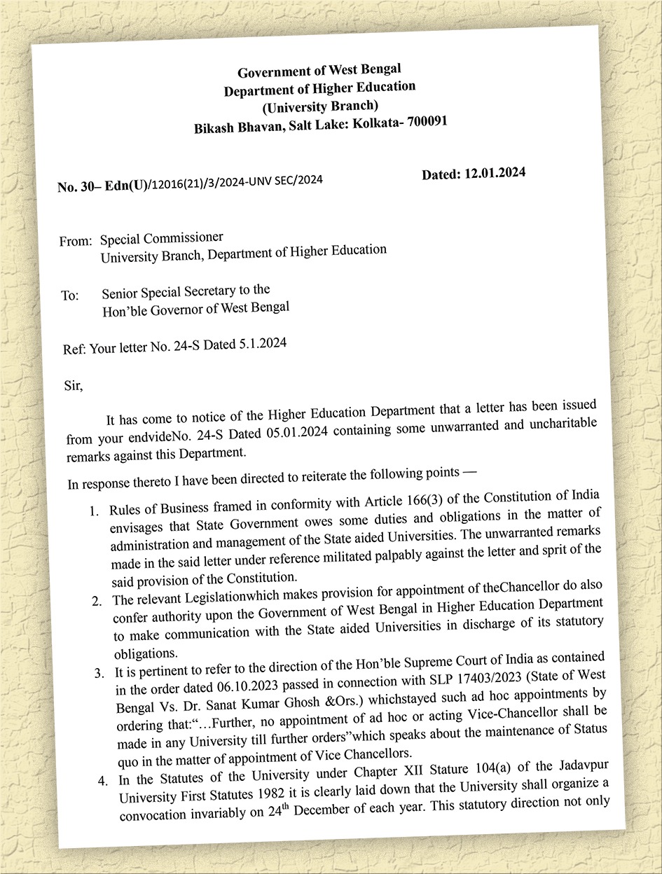 উচ্চশিক্ষা দফতর চিঠি দিয়ে সাফ জানিয়ে দিয়েছে, আচার্যের দফতরের কোনও ক্ষমতা নেই নতুন করে আইন বা স্ট্যাটুট গঠন করার। আচার্য শুধুমাত্র একটি সাংবিধানিক পদ। ৮ দফা বিষয় উল্লেখ করে এই কড়া চিঠি দেওয়া হয়েছে আচার্যকে। চিঠিতে উল্লেখ করা হয়েছে, ৫ জানুয়ারি বিশ্ববিদ্যালয়গুলোকে পাঠানো আচার্যের চিঠি আসলে অযৌক্তিক ও অকল্পনীয় যা উচ্চশিক্ষা দফতরের সুনাম ক্ষুণ্ণ করেছে। অকারণে উচ্চশিক্ষা দফতর সম্পর্কে বিরক্তিকর শব্দ লেখা হচ্ছে। এছাড়াও বলা হয়েছে, রাজ্য সরকারের বিশ্ববিদ্যালয়গুলির প্রশাসন ও ম্যানেজমেন্টে একাধিক কর্তব্য রয়েছে। একই সঙ্গে, বিশ্ববিদ্যালয়গুলিকে যে চিঠি দেওয়া হয়েছে সেই চিঠির প্রেক্ষিতে রাজ্যপালকে তার ক্ষমতা মনে করিয়ে ফের বিশ্ববিদ্যালয়গুলিকে জানিয়ে দিক বলেও জানানো হয়েছে চিঠিতে। একইসঙ্গে জানানো হয়েছে, কোনও আইন বা বিধিতে রাজ্যপালের সচিবালয়ের কোনও উল্লেখ নেই।