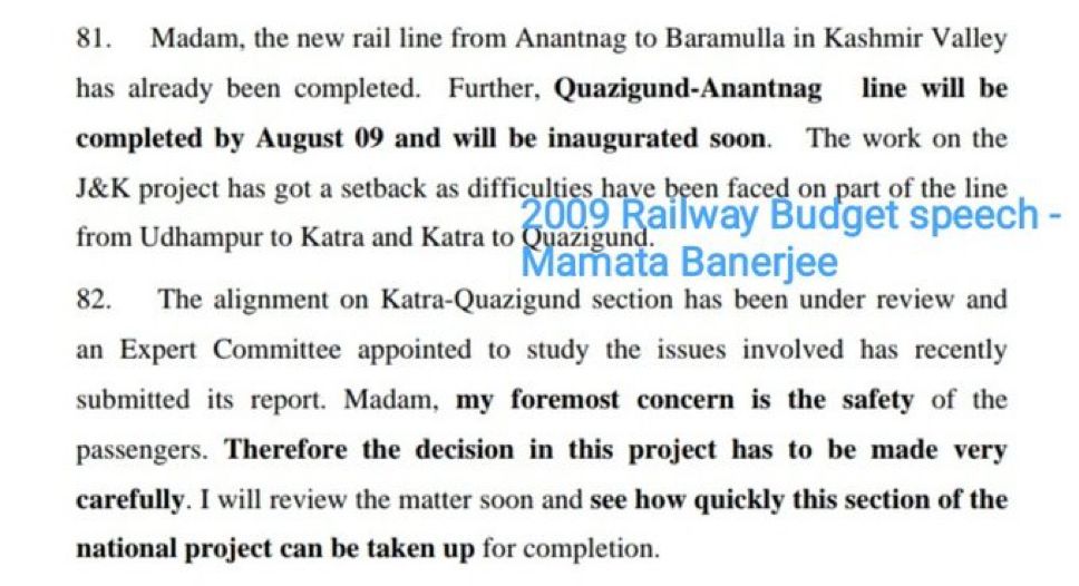 ৬. ২০০৯ সালে কাটরা-কাজিগুন্ড সেকশনের উদ্বোধন এবং বিশেষজ্ঞ কমিটি পাঠিয়েছিলেন রেলমন্ত্রী মমতা বন্দ্যোপাধ্যায়।