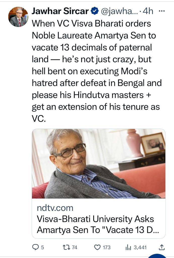 সংবাদদাতা, শান্তিনিকেতন : জমিবিতর্কে অমর্ত্য সেনের (Amartya Sen) পাশে দাঁড়িয়ে বিশ্বভারতীর উপাচার্য বিদ্যুৎ চক্রবর্তীকে ট্যুইটে আক্রমণ করলেন রাজ্যসভার তৃণমূল সাংসদ জহর সরকার (Jawhar Sircar- Visva Bharati)। লিখলেন, ‘লোকটি নির্লজ্জ। অধ্যাপক অমর্ত্য সেনের সম্পত্তির বিতর্কের মধ্যের উনি ঢুকছেন কেন? এই সম্পত্তির মধ্যে কোনও বিতর্ক নেই। উপাচার্য হিসেবে নিজের ব্যর্থতা থেকে মনোযোগ সরানোর জন্যই এসব করছেন। লজ্জা লাগে। চিনি ওঁকে। একেবারে নির্লজ্জ হয়ে গিয়েছেন। প্রথমে ভেবেছিলাম খেপে গিয়েছেন। তারপরে দেখলাম, খ্যাপা নয়, পিছনে মতলব আছে। নিজের এক্সটেনশন নেওয়ার।’ জহরের অভিযোগ, অমর্ত্য সেনের পৈতৃক সম্পত্তির তেরো ডেসিমেল জায়গা ফেরত নেওয়ার জন্য দৃঢ়সঙ্কল্প বর্তমান উপাচার্য। নরেন্দ্র মোদি বাংলায় একুশ সালে পর্যুদস্ত হয়েছেন। তিনি তাঁর হিন্দুত্ববাদী প্রভুকে সন্তষ্ট করে নিজের কার্যকালের সময়সীমা বর্ধিত করতে চাইছেন। উপাচার্যকে টাইটবাবু বলে কটাক্ষ করে জহরের (Jawhar Sircar- Visva Bharati) মন্তব্য, ‘‘মিলিটারি প্রশাসন জারি করেছেন বিশ্বভারতীতে। এর আগে কখনও হয়নি। কত অধ্যাপকের বিরুদ্ধে মামলা করেছেন। লক্ষ লক্ষ টাকা নষ্ট করেছেন বিশ্বভারতীর। কেস করে সবাইকে টাইট দিয়ে বেড়াচ্ছেন। তিনি টাইটবাবু হয়ে গিয়েছেন। ওঁর আমলে সব দিক দিয়ে বিশ্বভারতীর অবনমন ঘটেছে।’’ এ ব্যাপারে উপাচার্য বিদ্যুৎ চক্রবর্তীর প্রতিক্রিয়া জানতে চাইলে তাঁকে ফোনে পাওয়া যায়নি। অফিস থেকে বলা হয়, উনি মিটিংয়ে ব্যস্ত আছেন। জনসংযোগ আধিকারিক মহুয়া বন্দ্যোপাধ্যায়ও এনিয়ে কোনও মন্তব্য করতে চাননি। এই ঘটনার জেরে গণতান্ত্রিক লেখক শিল্পী সংঘ ও ভারতীয় গণনাট্যে সংঘের তরফেও রাজা সেন, পবিত্র সরকাররা অমর্ত্য সেনের পাশে দাঁড়িয়ে উপাচার্যের কার্যকলাপের নিন্দা করেছেন। তাঁরা বহু বিশিষ্টের স্বাক্ষর করা এক স্মারকলিপিও পাঠিয়েছেন।
