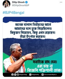এই পর্যন্ত ঠিকই ছিল কিন্তু হঠাৎ করে দিলীপ ঘোষের একটি টুইটকে কেন্দ্র করে জোর জল্পনা শুরু হয়েছে। রাজীব দল ছাড়ার পর দিলীপ ঘোষ টুইটে লেখেন, ”অনেক দালাল নির্বাচনের আগে আমাদের দলে ঢুকে গিয়েছিলেন। কিছুজন গিয়েছেন। কিছু এখন রয়েছেন। তাঁরা উৎপাত করছেন। সবাইকে বাদ দেব। এরা চায় না বিজেপি শক্তিশালী হোক।”