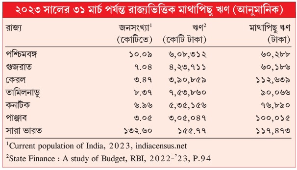 এবার ঋণের বোঝা নিয়ে ভারতের অন্য রাজ্যগুলির প্রসঙ্গে আসা যাক। বামফ্রন্টের নেতারা কেরল নিয়ে খুবই বড়াই করেন। ২০২৩ সালের ৩১ মার্চ পর্যন্ত কেরল রাজ্যে মাথাপিছু ঋণ ১ লক্ষ ১২ হাজার ৬৩৯ কোটি টাকা। পশ্চিমবঙ্গ বা গুজরাত রাজ্যের প্রায় দ্বিগুণ।