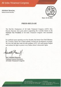 বৃহস্পতিবার তৃনমূল কংগ্রেসের সর্বভারতীয় সাধারণ সম্পাদক অভিষেক বন্দোপাধ্যায় চিঠি দিয়ে লুইজিনহ ফেলারিওকে দলের সর্বভারতীয় সহ সভাপতি পদে নিযুক্তির কথা জানিয়েছেন। এই খবরে খুশির হাওয়া গোয়াতে।