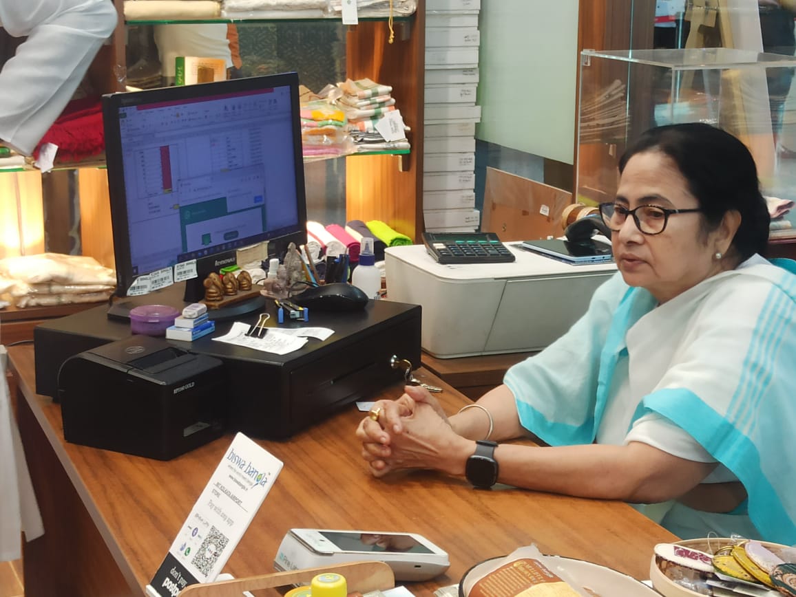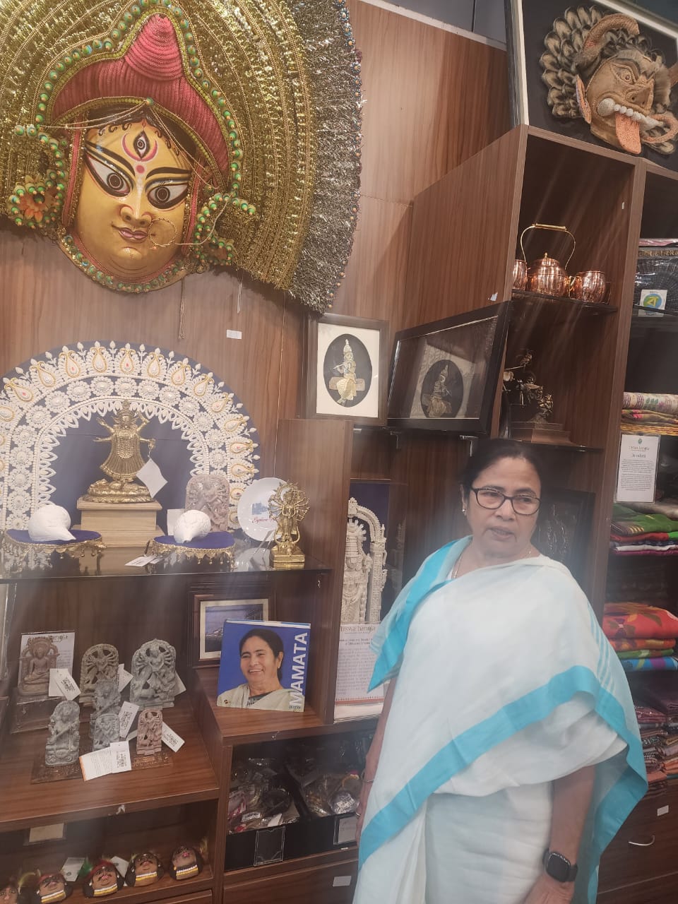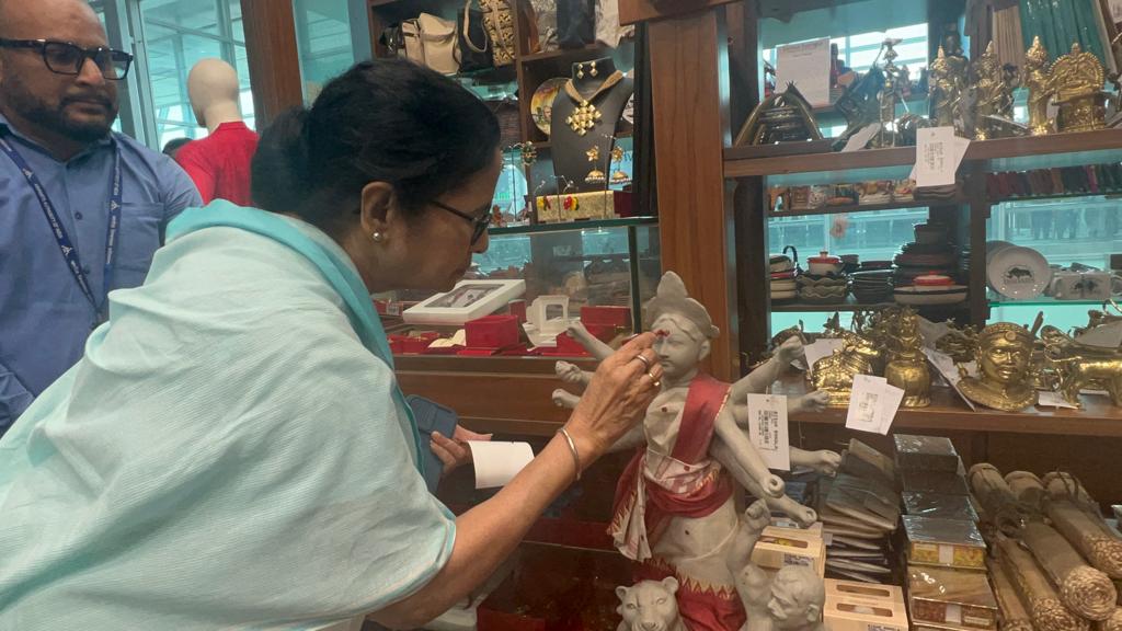 সকালে বিমানবন্দরে এসেই মুখ্যমন্ত্রী ঘুরে দেখা শুরু করেন বিভিন্ন স্টল। ঘুরে ঘুরে দেখলেন বিশ্ববাংলার স্টলটি। কোথাও হাতের কাজ করা দুরন্ত মূর্তি, আবার কখনও পাঞ্জাবি থেকে শাড়ি। খুঁটিয়ে খুঁটিয়ে নানা প্রশ্ন করছিলেন বিশ্ববাংলার কর্মীদের। এরপরেই হাতে তুলে নিলেন রঙ তুলি। বিশ্ববাংলার স্টলের দুর্গাপ্রতিমায় চক্ষুদান করলেন মুখ্যমন্ত্রী মমতা বন্দ্যোপাধ্যায়। বিরল দৃশ্য। ব্যতিক্রমী দৃশ্য। সাক্ষী রইল কলকাতা বিমানবন্দর।