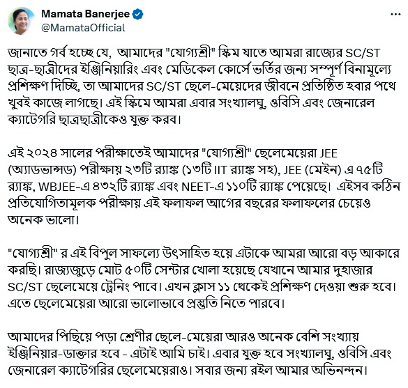 মুখ্যমন্ত্রী জানিয়েছেন, জানাতে গর্ব হচ্ছে যে, আমাদের ‘যোগ্যশ্রী’ প্রকল্প, যাতে আমরা রাজ্যের তফসিলি জাতি উপজাতির ছাত্রছাত্রীদের ইঞ্জিনিয়ারিং এবং মেডিক্যাল কোর্সে ভর্তির জন্য সম্পূর্ণ বিনামূল্যে প্রশিক্ষণ দিচ্ছি, তা আমাদের ছেলেমেয়েদের জীবনে প্রতিষ্ঠিত হওয়ার পথে খুবই কাজে লাগছে। প্রকল্পের বিপুল সাফল্যে উৎসাহিত হয়ে এটাকে আমরা আরও বড় আকারে করছি। এখন একাদশ শ্রেণি থেকেই প্রশিক্ষণ দেওয়া শুরু হবে। এতে ছেলেমেয়েরা আরও ভালভাবে প্রস্তুতি নিতে পারবে।