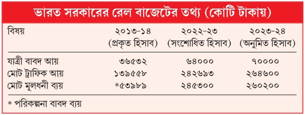 (১) গত অর্থবছরে (২০২২-২৩) রেলে মূলধনী ব্যয় ছিল ২,৪৫,৩০০ কোটি টাকা। এই ব্যয়ে ১৭টি খাত রয়েছে (যেমন নতুন লাইন নির্মাণ, ডবল লাইন নির্মাণ, রোলিং স্টক ইত্যাদি)। এই খাত থেকে গত অর্থবছরে প্রায় ৫০টি ‘বন্দে ভারত’ ট্রেন তৈরি হয়েছে এবং প্রায় দেড় হাজার কিলোমিটার অর্থাৎ মোট রেলের প্রায় ৫% অংশে ‘কবচ’ নির্মাণ হয়েছে।