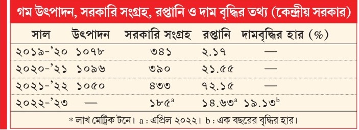 তৎসত্ত্বেও এপ্রিল ২০২২ পর্যন্ত কৃষকদের থেকে সরকার গম ক্রয় করেছেন মাত্র ১৮৫ লক্ষ মেট্রিক টন এবং রপ্তানি করেছেন ১৪.৬৩ লক্ষ মেট্রিক টন। বাস্তব অবস্থা তুলনা করলে দেখা যাচ্ছে, ৫০ লক্ষ মেট্রিক টনের মতো গম কম উৎপাদন হওয়া সত্ত্বেও সরকার সংগ্রহ করেছেন ৪৩৩ লক্ষ মেট্রিক টনের পরিবর্তে মাত্র ১৮৫ লক্ষ মেট্রিক টন। ২০২১-’২২ সালের সংগ্রহের মাত্র ৪৩ শতাংশ সংগ্রহ করা হয়েছে। প্রায় ২৫০ লক্ষ টন সংগ্রহ করতে ব্যর্থ হয়েছে সরকার। অন্যদিকে ৭২ লক্ষ টন গম রপ্তানির পরিবর্তে সরকার মাত্র ১৫ লক্ষ টনের মতো রপ্তানি করেছে। অর্থাৎ ২০২১-’২২ সালের তুলনায় ২০ শতাংশের মতো রপ্তানি করেছে সরকার। তথ্যে আরও স্পষ্ট যে ৪৬ লক্ষ টনের মতো উৎপাদন হ্রাস পাওয়ায় গত বছরের তুলনায় বর্তমান বছরে সরকার ৬০ লক্ষ টন গম রপ্তানি কম করতে চলেছে এবং ২৫০ লক্ষ টন গম কৃষকদের থেকে কম সংগ্রহ করেছে। তাই সরকারের বক্তব্য এক্ষেত্রে নিঃসন্দেহে ভ্রান্ত।