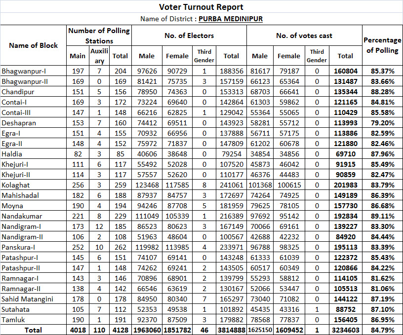 সংবাদদাতা, পূর্ব মেদিনীপুর : বৃষ্টিকে উপেক্ষা করেই পূর্ব মেদিনীপুর জেলায় শেষ পর্যন্ত ৮৪.৭৯ শতাংশ ভোট (Panchayat Election) পড়ল। জেলার ২৫টি ব্লকের মধ্যে সবচেয়ে বেশি ভোট পড়েছে নন্দকুমার ব্লকে (৮৯.১১ শতাংশ)। সবচেয়ে কম শতাংশ কাঁথির দেশপ্রাণ ব্লকে (৭৯.২০ শতাংশ)। জেলার মোট ৪১২৮ বুথের বেশ কটিতে রাত পর্যন্ত ভোট হয়। মোট ৩২,৩৪,৬০৩ ভোটার গণতান্ত্রিক অধিকার প্রয়োগ করেন। এঁদের মধ্যে পুরুষ ভোটারের সংখ্যা ছিল ১৬,২৫,১৫০ জন। মহিলা ভোটার ছিলেন ১৬,০৯,৪৫২ জন এবং ১ জন তৃতীয় লিঙ্গের ব্যক্তি। যে দুটি ব্লকের উপর সারা রাজ্যের নজর ছিল, সেই নন্দীগ্রাম ১ ব্লকে ভোট পড়েছে ৮৩.৩০ শতাংশ। নন্দীগ্রাম ২ ব্লকে একটু বেশি, ৮৪.৪৪ শতাংশ ভোট পড়েছে। হলদিয়াতে ভোট পড়েছে ৮৭.৯৬ শতাংশ। বিজেপির সন্ত্রাস-কবলিত ময়না ব্লকের ১৫৪টি বুথে ভোট (Panchayat Election) পড়েছে ৮৬.৬৮ শতাংশ। জেলা প্রশাসনের দেওয়া পরিসংখ্যান বলছে, মন্ত্রী অখিল গিরির রামনগর বিধানসভা এলাকায় রামনগর ১ ব্লকে ভোট পড়ে ৮১.৬২ শতাংশ। রামনগর ২ ব্লকে ৮১.০৬ শতাংশ। মৎস্যমন্ত্রী বিপ্লব রায়চৌধুরীর কোলাঘাট ব্লকের ২৫৯টি বুথে ভোট পড়েছে ৮৩.৭৯ শতাংশ। পূর্ব মেদিনীপুর জেলা পরিষদের বিদায়ী সভাধিপতি উত্তম বারিক খেজুরি ১ ব্লকে জেলা পরিষদ আসনে প্রতিদ্বন্দ্বিতা করেছেন। সেখানে ভোট পড়েছে ৮৫.৪৯ শতাংশ।