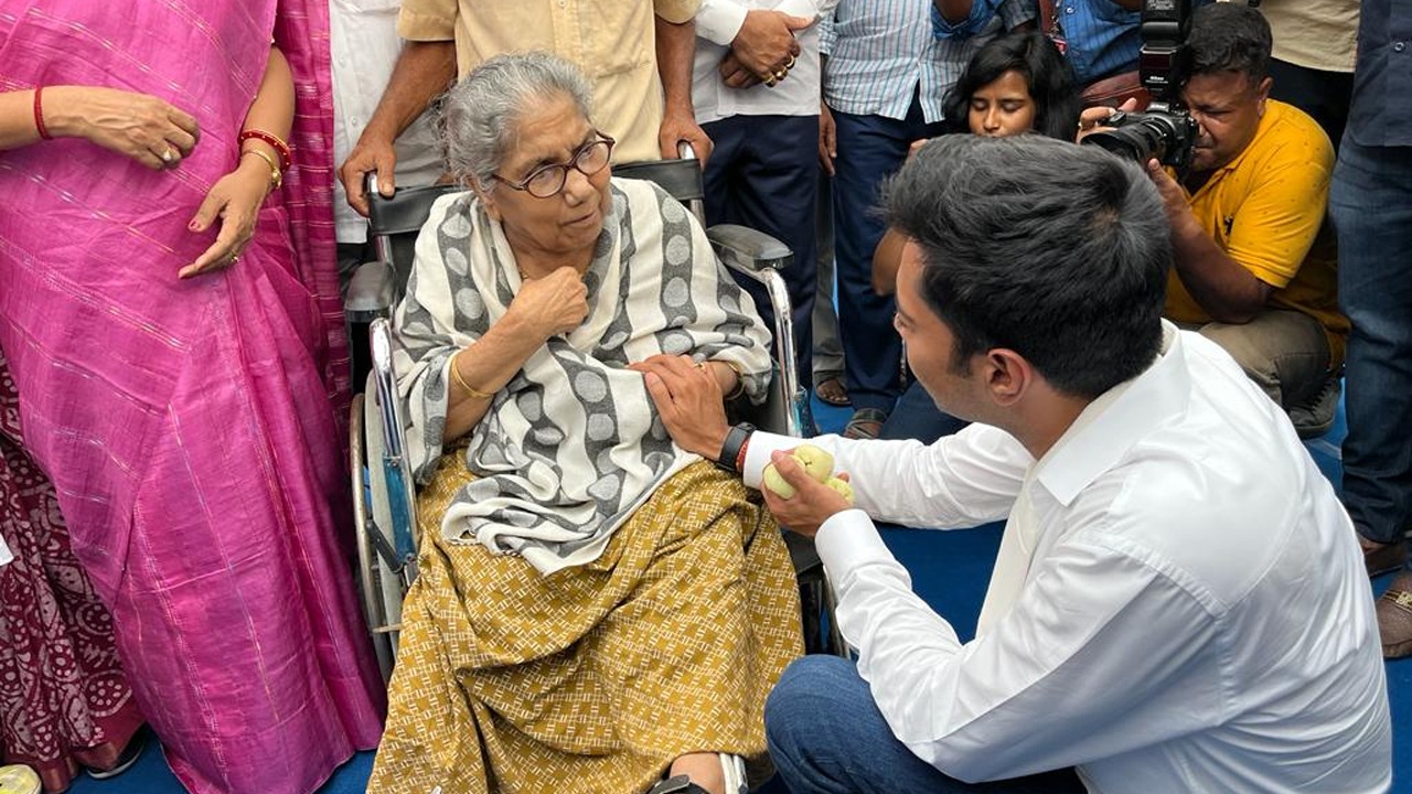 মহিষাদলে তীব্র গরম। তার মধ্যে হুইল চেয়ারে ঠায় বসে ছিলেন স্থানীয় বাসিন্দা ৭৬ বছর বয়সী ঝর্না মিত্র (Jharna Mitra)। অভিষেক বন্দ্যোপাধ্যায়ের সঙ্গে দেখা করতে চান তিনি। তাঁকে দেখেই এগিয়ে এসে প্রণাম করেন অভিষেক। তাঁকে দুহাত তুলে আর্শীবাদ করেন বৃদ্ধা। বলেন, তোমার সঙ্গে দেখা করে আমি ধন্য। তুমি আমার নাতির মতো। তোমায় অনেক আশীর্বাদ করি। অভিষেকের হাতে গাছে দুটি জামরুল তুলে দেন ঝর্না দেবী। তাঁর অসুস্থতার সম্পর্কে বিশদে জানতে চান অভিষেক। সম্মানের সঙ্গে সেই উপহার গ্রহণ করেন তৃণমূলের সর্বভারতীয় সাধারণ সম্পাদক। সেই ঘটনার কথা নিজের ফেসবুক পেজে লেখেন। “আজ এক বিরল ঘটনা আমার স্মৃতির মণিকোঠায় আজীবন স্থান করে থাকবে। রোড শো চলাকালীন এক বিশেষভাবে সক্ষম বৃদ্ধা আমার দিকে এগিয়ে আসেন। পরম মমতায় তিনি আমার দিকে এগিয়ে দেন তাঁর গাছের কয়েকটি ফল। শুধু আমাকে এই ফলগুলি দেবেন বলে ঘণ্টার পর ঘণ্টা তিনি নিজের শারীরিক কষ্ট ভুলে আমার জন্য অপেক্ষা করেছিলেন! এই উপহার আমার কাছে পরম আশীর্বাদ তুল্য। উপহারটি পেয়ে আমার অন্তরাত্মা যে কতখানি তৃপ্ত হয়েছে, তা কথায় প্রকাশ করা দুঃসাধ্য।“