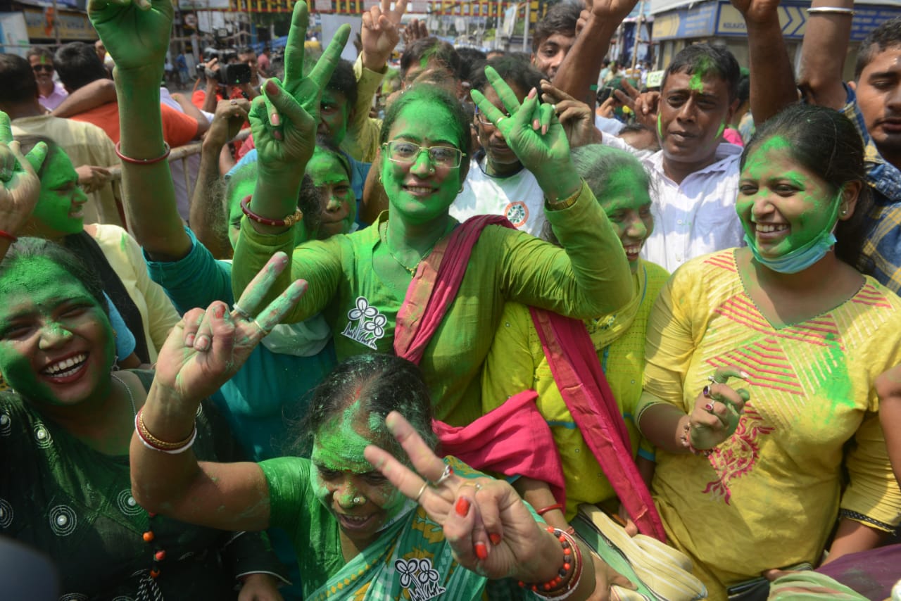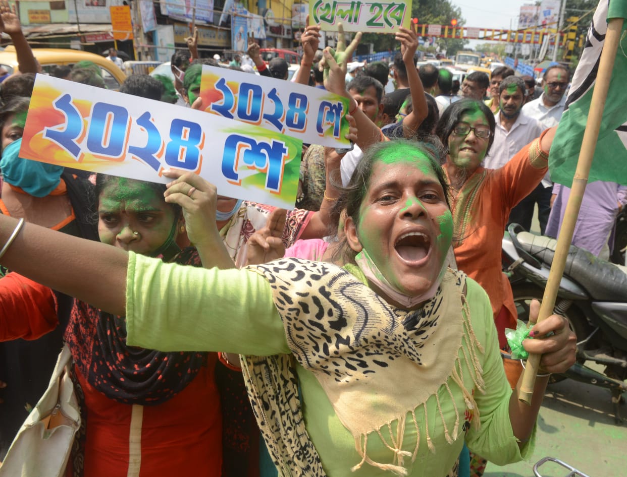 অন্যদিকে কালীঘাটে নেত্রীর বাড়ির সামনে সকাল বেলাতেই শুরু হয়ে গিয়েছিল উচ্ছ্বাস-উদ্দীপনা। সকাল ৮ থেকে গণনা শুরু হয়। প্রথমেই পোস্টাল ব্যালট। এগিয়ে গেলেন মমতা বন্দ্যোপাধ্যায়। ৯টার কিছু পর থেকে শুরু হয় ইভিএম গণনা। মোট ২১ রাউন্ড। প্রথম রাউন্ডেই দলনেত্রী মনতা বন্দ্যোপাধ্যায় কয়েকশো ভোটে এগিয়ে গিয়েছেন খবর পাওয়া মাত্রই শুরু হল খেলা হবে গানের সঙ্গে তুমুল নাচ। শুরুটা করলেন মহিলারাই। সেখানে নবীন প্রবীন সব প্রজন্মই হাজির৷ সঙ্গে উড়তে লাগল দেদার সবুজ আবির।