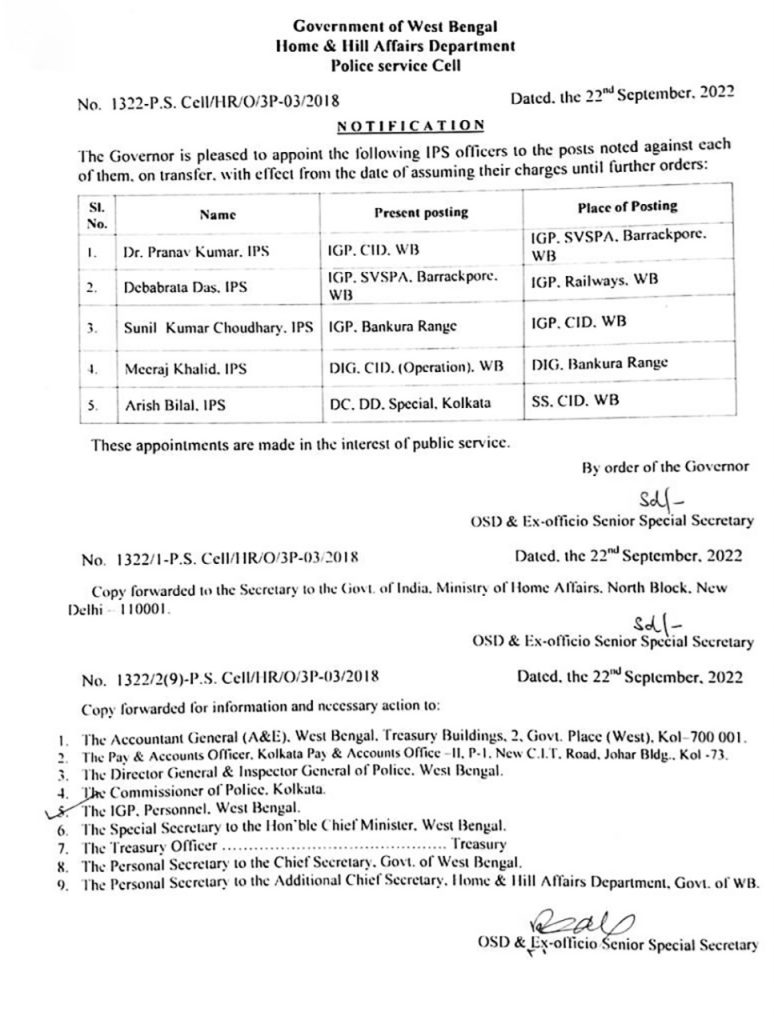প্রতিবেদন : পুজোর মুখে পুলিশের শীর্ষ স্তরে বড়সড় রদবদল (West Bengal Police Reshuffle)। বৃহস্পতিবার ৬ জন আইপিএসের দায়িত্ব (West Bengal Police Reshuffle) বদল হল। এদিন স্বরাষ্ট্র দফতর থেকে এই সংক্রান্ত বিজ্ঞপ্তি প্রকাশ করা হয়েছে। বাঁকুড়া রেঞ্জের আইজিপি সুনীলকুমার চৌধুরীকে আইজি সিআইডি করা হয়েছে। মিরাজ খালিদকে বাঁকুড়া রেঞ্জের ডিআইজি করা হয়েছে। তিনি এতদিন সিআইডি অপারেশন ছিলেন। আরিস বিলাল এসএস সিআইডি করা হয়েছে। তিনি এতদিন কলকাতা পুলিশের ডিসিডিডি স্পেশ্যাল ছিলেন। দেবব্রত দাস আইজি রেলওয়ে হলেন। তিনি বারাকপুরের এসভিএসপি-এর আইজি ছিলেন। আইপিএস প্রণব কুমার বারাকপুরের এসভিএসপি-এর আইজি হলেন। তিনি এতদিন সিআইডির আইজি ছিলেন।