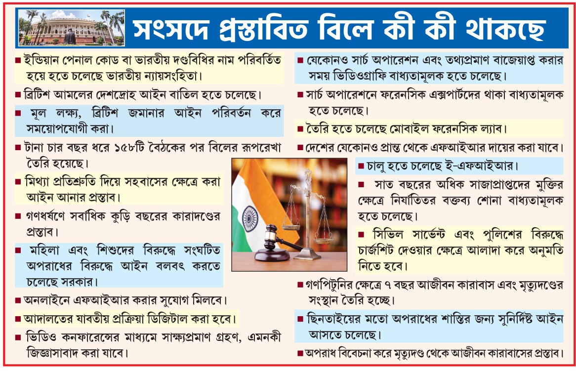 সংসদে বিল উত্থাপনের সময় এদিন স্বরাষ্ট্রমন্ত্রী বলেন, ‘‘প্রত্যেকের কথা বলার অধিকার আছে। আমরা সম্পূর্ণরূপে রাষ্ট্রদ্রোহিতা বাতিল করছি।’’ এছাড়াও অমিত শাহ ব্রিটিশ আমলের ভারতীয় দণ্ডবিধি (আইপিসি), ফৌজদারি কার্যবিধি (সিআরপিসি) এবং ভারতীয় সাক্ষ্য আইন বদল করতে এবং গণপিটুনি, নাবালিকাদের উপর যৌন নিপীড়নের জন্য মৃত্যুদণ্ড, গণধর্ষণের জন্য ২০ বছরের কারাদণ্ডের বিধান করার জন্য বিল পেশ করেছেন। শাহের পেশ করা বিল অনুযায়ী, ভারতীয় দণ্ডবিধির বদলে এবার সেটা হতে চলেছে ন্যায়সংহিতা। ক্রিমিনাল প্রসিডিউর কোড এবার হতে চলেছে ভারতীয় নাগরিক সুরক্ষা সংহিতা। নতুন বিলে ‘দেশদ্রোহ’ শব্দটি অপসারণ করা হয়েছে এবং কিছু পরিবর্তন সহ ১৫০ ধারায় বিধানটি বহাল রাখা হয়েছে।