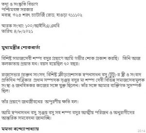 মমতা লেখেন,” বিশিষ্ট সমাজসেবী শম্পা বসুর প্রয়াণে আমি গভীর শোক প্রকাশ করছি। তিনি আজ কলকাতায় প্রয়াত হন। বয়স হয়েছিল ৭০ বছর। রাজ্যসভার প্রাক্তন সাংসদ, বিশিষ্ট ক্রীড়াপ্রশাসক স্বপনসাধন বসু (টুটু)-র স্ত্রী ও সংবাদ প্রতিদিন পত্রিকার প্রধান সম্পাদক সৃঞ্জয় বসুর মা শম্পা দেবী বিভিন্ন সমাজসেবামূলক সংস্থা ও জনহিতকর কাজের সঙ্গে যুক্ত ছিলেন। তাঁর সঙ্গে আমার ব্যক্তিগত সুসম্পর্ক ছিল। তাঁর প্রয়াণে জনজীবনের অপূরণীয় ক্ষতি হল। আমি স্বপনসাধন বসু, সৃঞ্জয় বসু সহ শম্পা বসুর আত্মীয় পরিজন ও অনুরাগীদের আন্তরিক সমবেদনা জানাচ্ছি।”