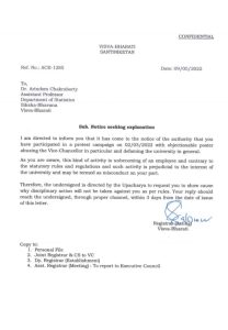 অভিযোগ, ২ মার্চ হাতে আপত্তিকর পোস্টার নিয়ে উপাচার্যকে নিন্দা করে এবং বিশ্বভারতীর সম্মানহানি করে একটি প্রতিবাদ কর্মসূচিতে অংশগ্রহণ করেন অধ্যাপক চক্রবর্তীও। যেটা বিশ্বভারতীর কর্মচারীদের সার্ভিস রুলের পরিপন্থী। তাই তাঁকে নোটিশ পাঠিয়ে জানতে চাওয়া হয়, তাঁর বিরুদ্ধে কেন শৃঙ্খলাভঙ্গকারী হিসেবে বিধিবদ্ধ ব্যবস্থা নেওয়া হবে না।