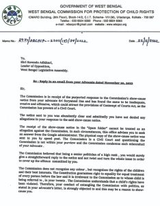 প্রতিবেদন : রাজ্যের বিরোধী দলনেতাকে আবার কড়া ভাষায় চিঠি দিল রাজ্য শিশু অধিকার সুরক্ষা কমিশন। কমিশনের শোকজের প্রেক্ষিতে আইনজীবী মারফত একটি চিঠি দিয়েছিলেন শুভেন্দু। সেই চিঠিতে কমিশনের বিরুদ্ধে পাল্টা কিছু অভিযোগ এনেছেন তিনি। এরই জবাবে কমিশনের চেয়ারপার্সন সুদেষ্ণা রায় মঙ্গলবার স্পষ্ট জানিয়েছেন, কমিশন দেওয়ানি আদালতের সমমর্যাদাসম্পন্ন। কমিশনকে কোনও প্রশ্ন করার এক্তিয়ার শুভেন্দু অধিকারীর নেই।