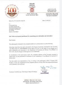 সোমবার রাতে এঁদের হাতে বহিষ্কারের চিঠি ধরিয়ে বলা হয়, যদি কোনও বক্তব্য থাকে বা সিদ্ধান্ত পুনর্বিবেচনার জন্য আবেদন করতে হয় তাহলে ২৭ অগাস্টের মধ্যে বিশ্বভারতীর প্রক্টরের কাছে লিখিত আকারে জমা দিতে হবে। সময়সীমা পেরিয়ে গেলে বহিষ্কারের সিদ্ধান্ত বহাল থাকবে। চলতি বছরে ১৪ জানুয়ারি অর্থনীতি ও রাজনীতি বিভাগের ছাত্র ফাল্গুনী পান ও সোমনাথ সৌ এবং হিন্দুস্থানি শাস্ত্রীয় সংগীতের ছাত্রী রূপা চক্রবর্তীর বিরুদ্ধে তদন্ত কমিটি বসিয়ে শৃঙ্খলাভঙ্গের অভিযোগে সাসপেন্ড করে।