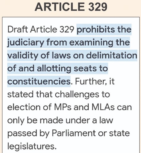 ১. ৩২৯-এর ধারায় বলা আছে, নির্বাচনে আসনে বণ্টন বা কেন্দ্রের পুনর্বিন্যাস, কোনও ক্ষেত্রেই আদালত হস্তক্ষেপ করতে পারে না। নির্বাচনের ফলাফল সংক্রান্ত যদি কোনও অভিযোগ জানাতে হয় তাহলে নির্বাচনী পিটিশন দাখিল করতে হবে।